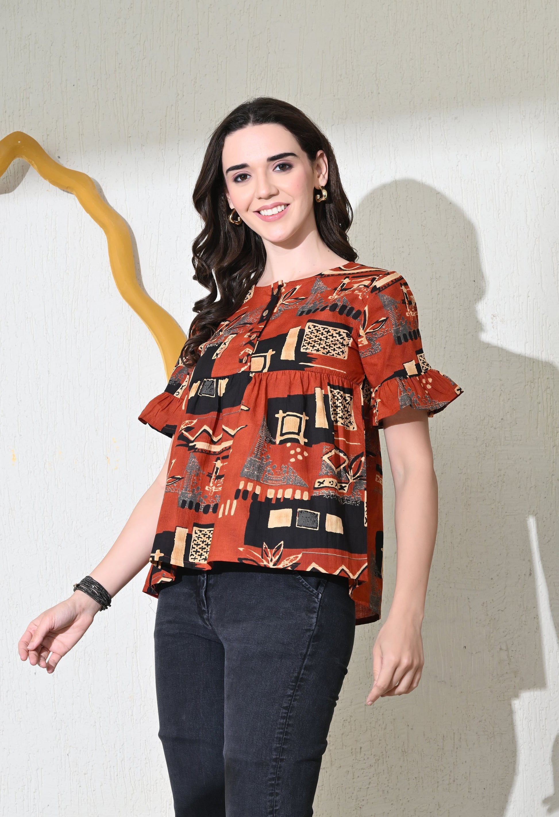 - Description: Women Beautiful Floral Printed Empire Top Has A round Neck, frill Sleeves And Detaling Of Gathers and Opening Buttons On Front