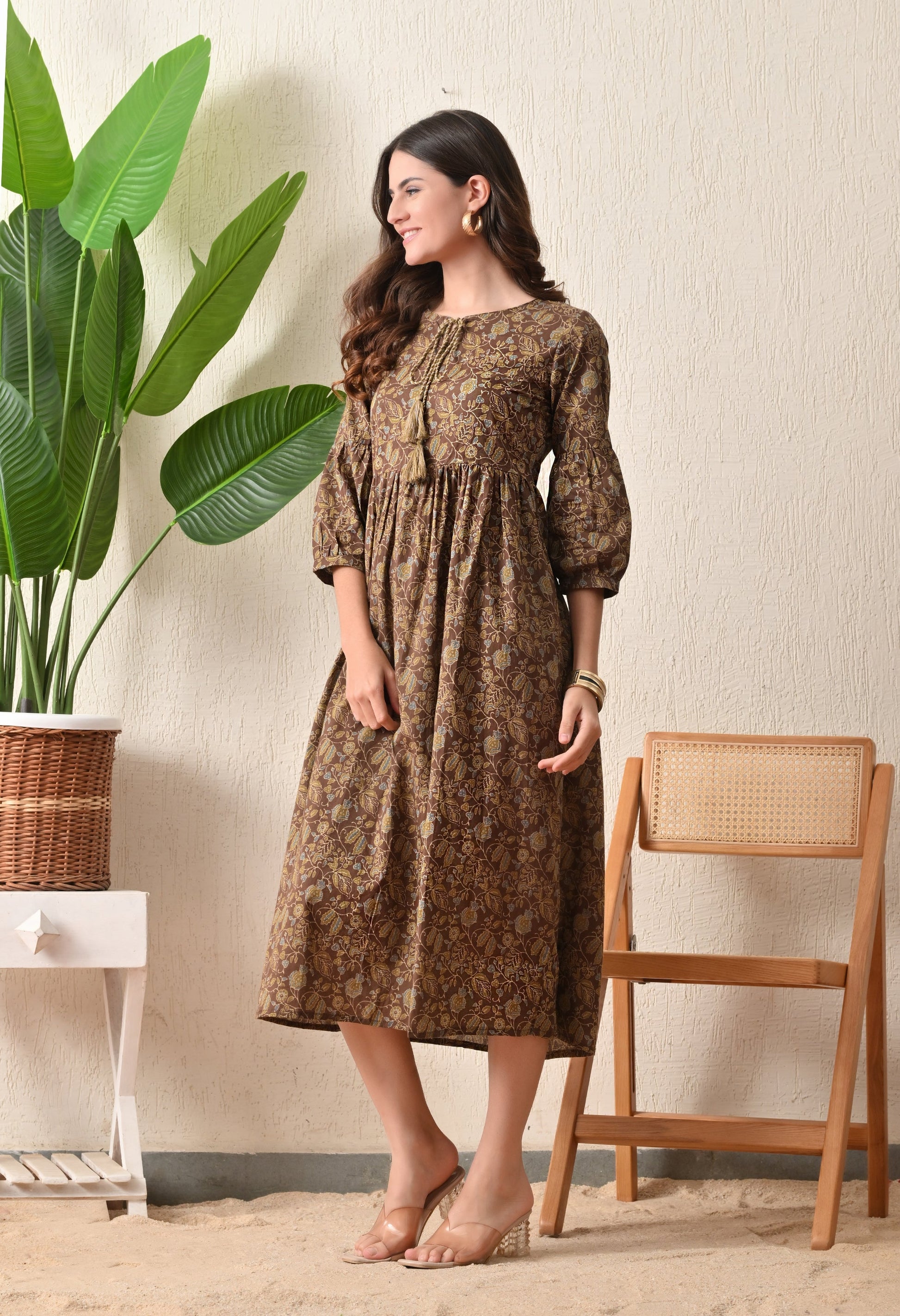 - Description: Brown Ajrak Women Tiered Dress With tussels, Detaling designed exclusively for women who value both style and comfort. Crafted from high-quality breathable cotton fabric, this set ensures you stay cool and confident throughout your day.