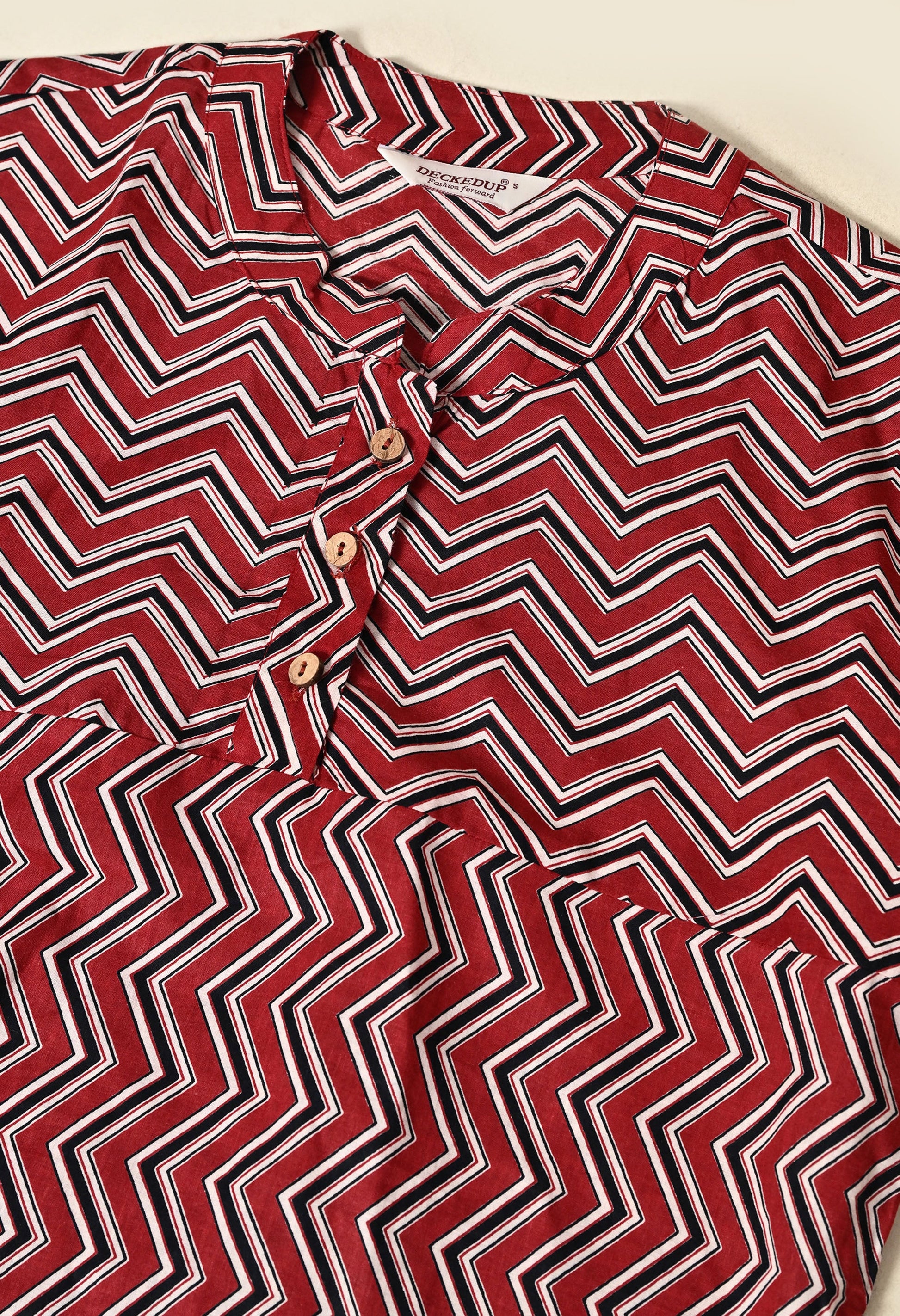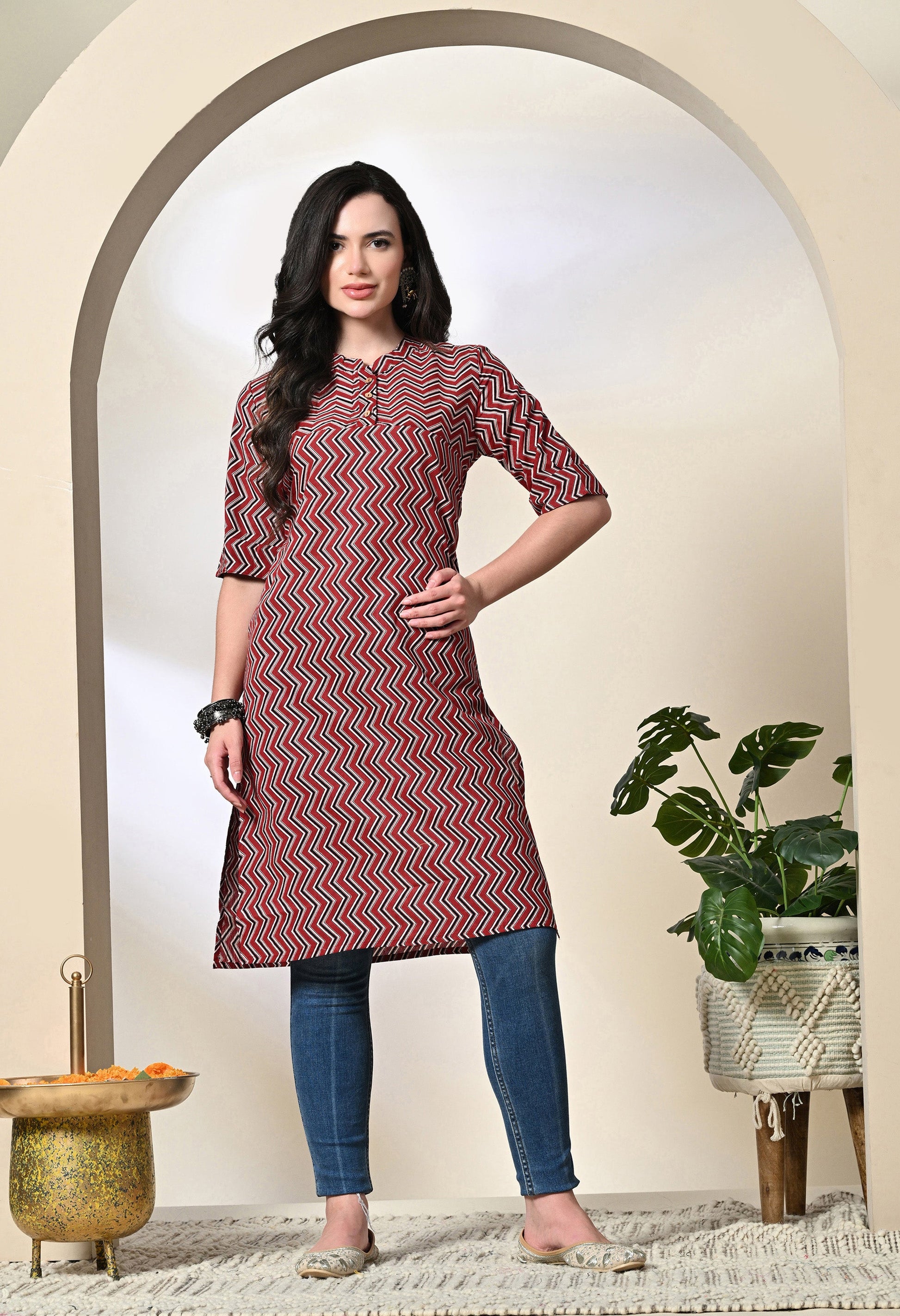 - Description: Maroon print straight Long Tunic has collar neck, button opening, digital print detail & elbow sleeves. Tailored from perfection to make you feel comfortable at shopping day and office.