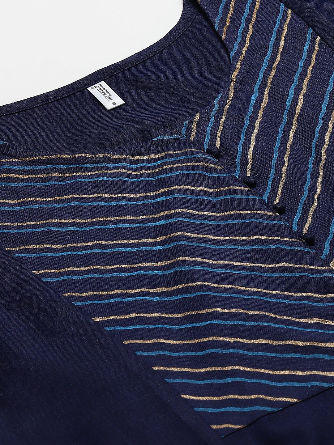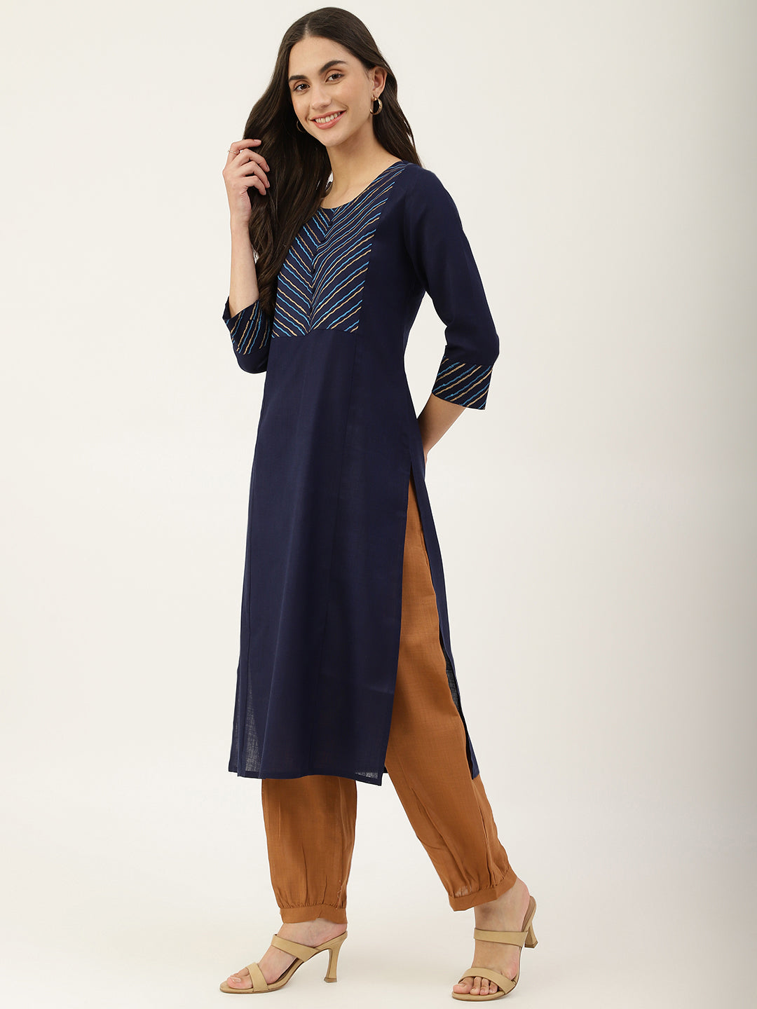 • Description: Blue round neck straight Kurta with handblock yoke,three-forth sleeves.