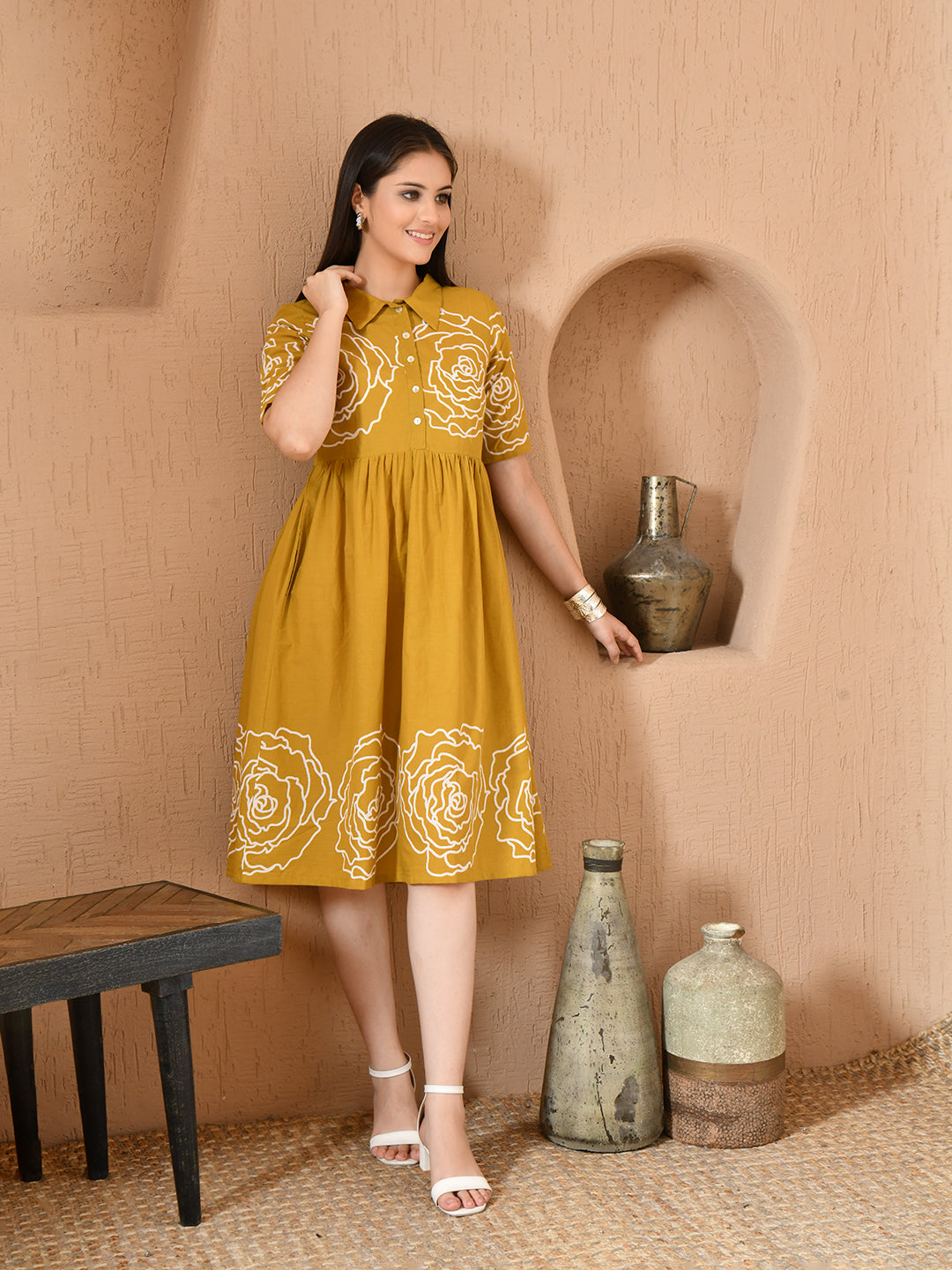 - Description: Look effortlessly stylish wearing this fashionable Mustard Cotton Pocket Dress. The flare gives shape and structure to your look and makes you more charming and bold for the day.
