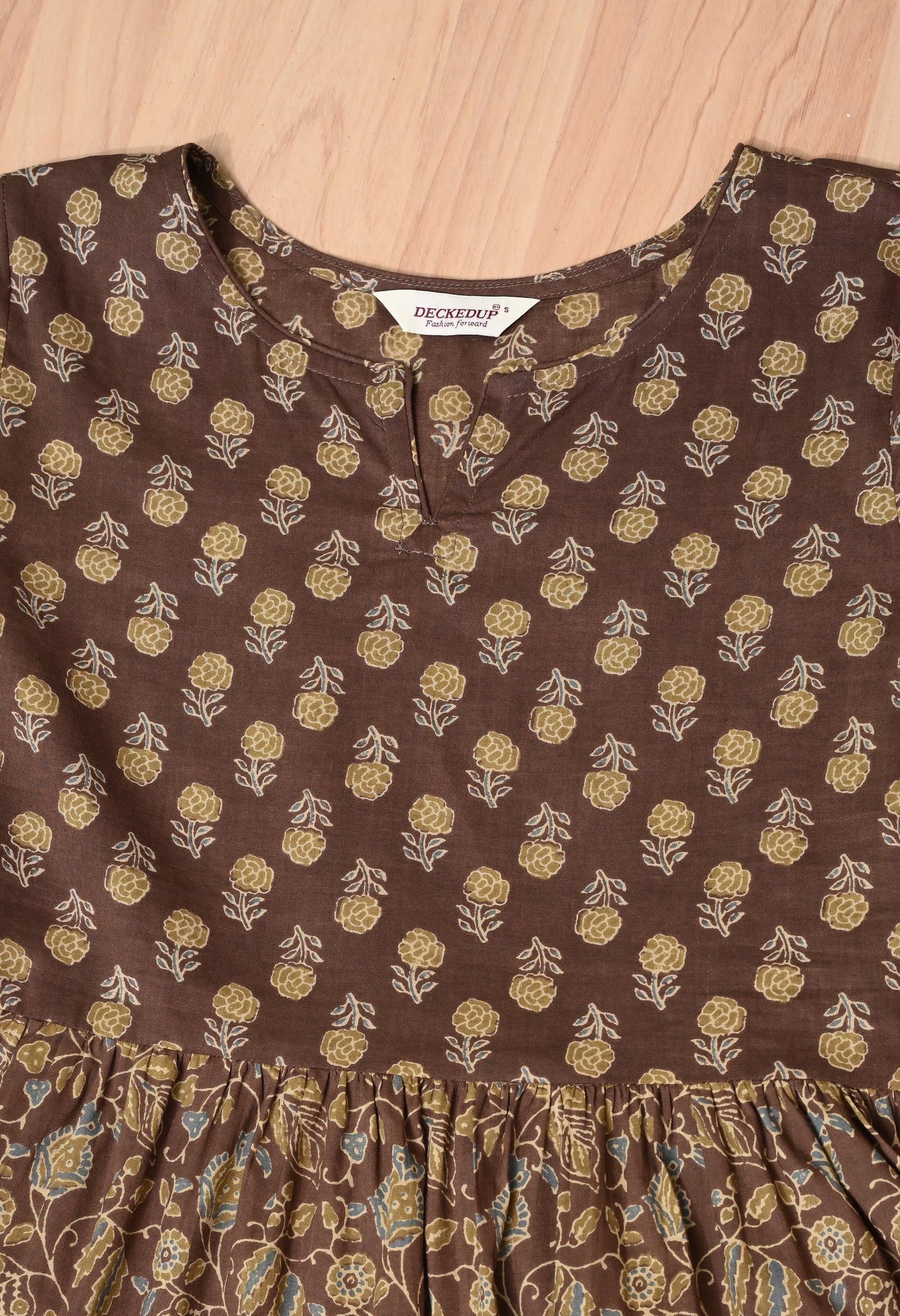 - Description: Green Long Flared Tier Dress With Beautiful ajrak Print and Gathers On The Waistline and has a pocket as well.Beautifully designed and gives comfort Fit are the unique feature Can wear all day at home or office or shopping..