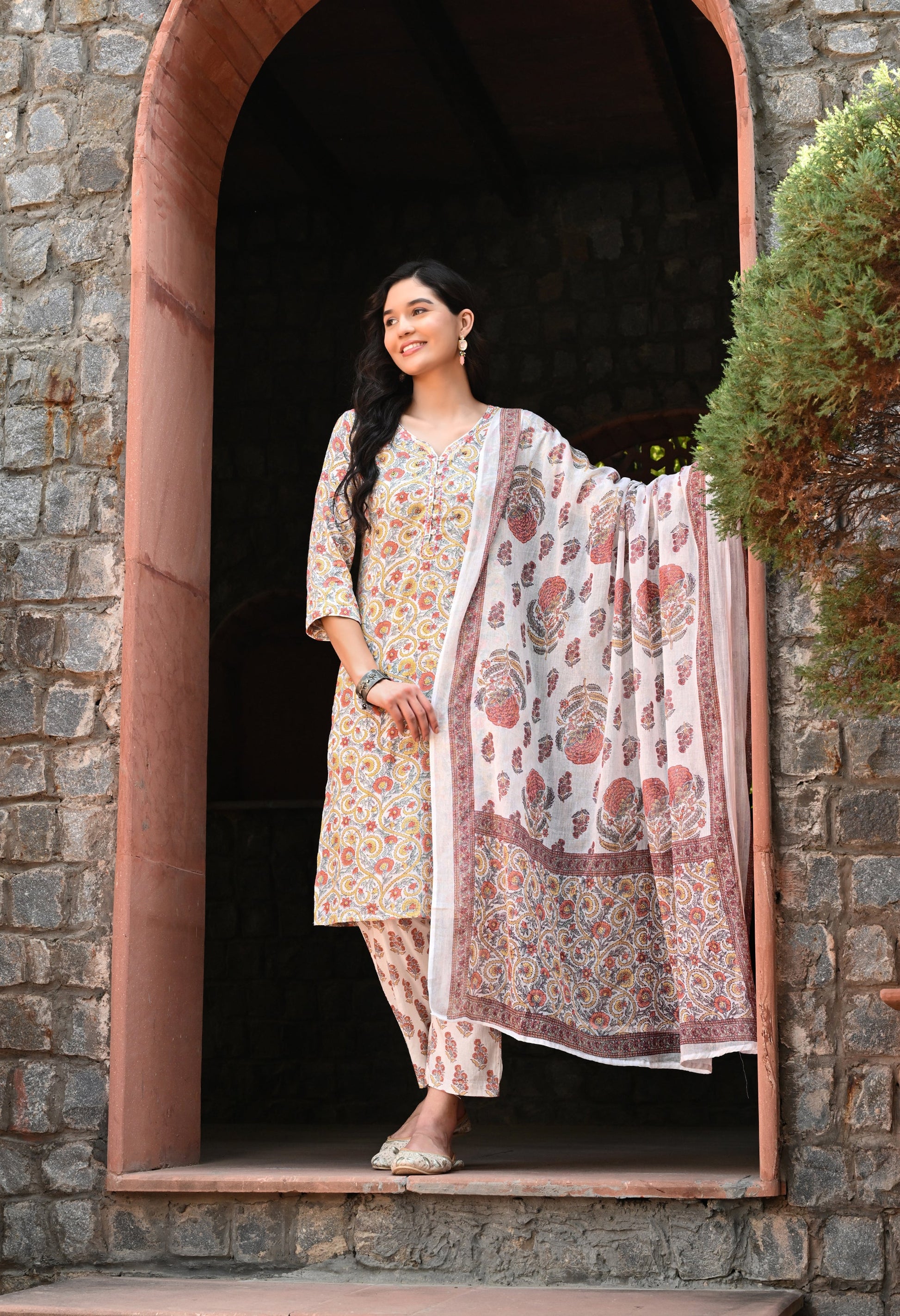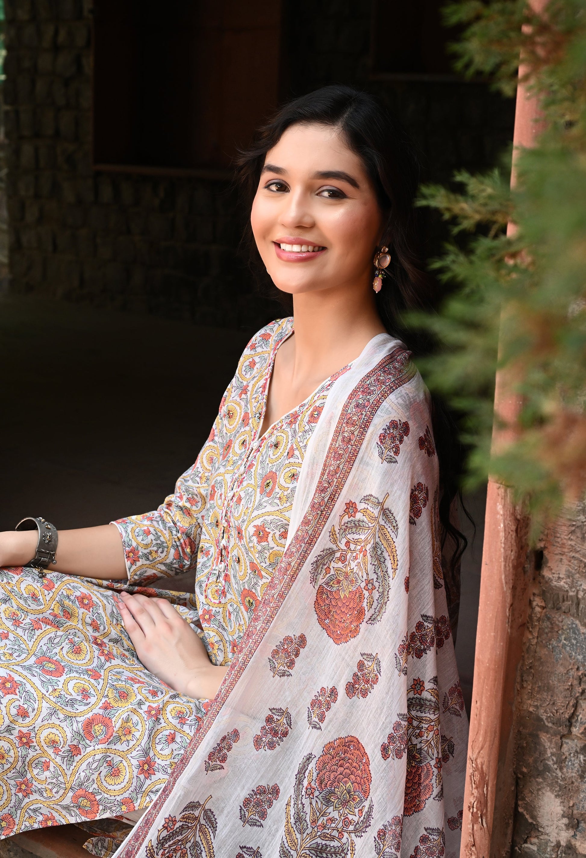 - Description: This Embroidered Cotton Kurta Pant Dupatta Set is made of quality cotton, and features a flared silhouette, ethnic print, and adjustable elastic waistband that ensures the perfect fit. Make a statement with this elegant and comfortable piece.