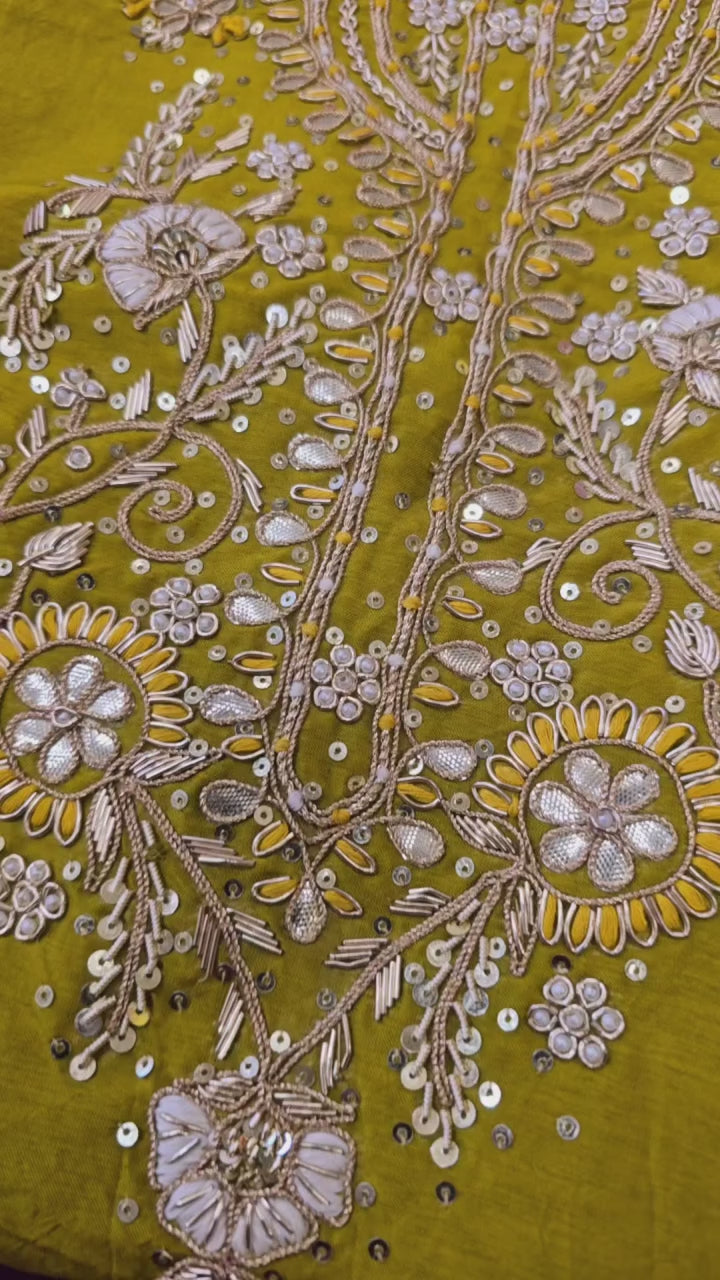 This exclusive dress material features intricate hand Zardosi embroidery meticulously crafted on pure Dola Silk, offering a luxurious texture and rich aesthetic. The combination of traditional embroidery with high-quality silk ensures a refined look perfect for special occasions, reflecting expert craftsmanship and timeless elegance.