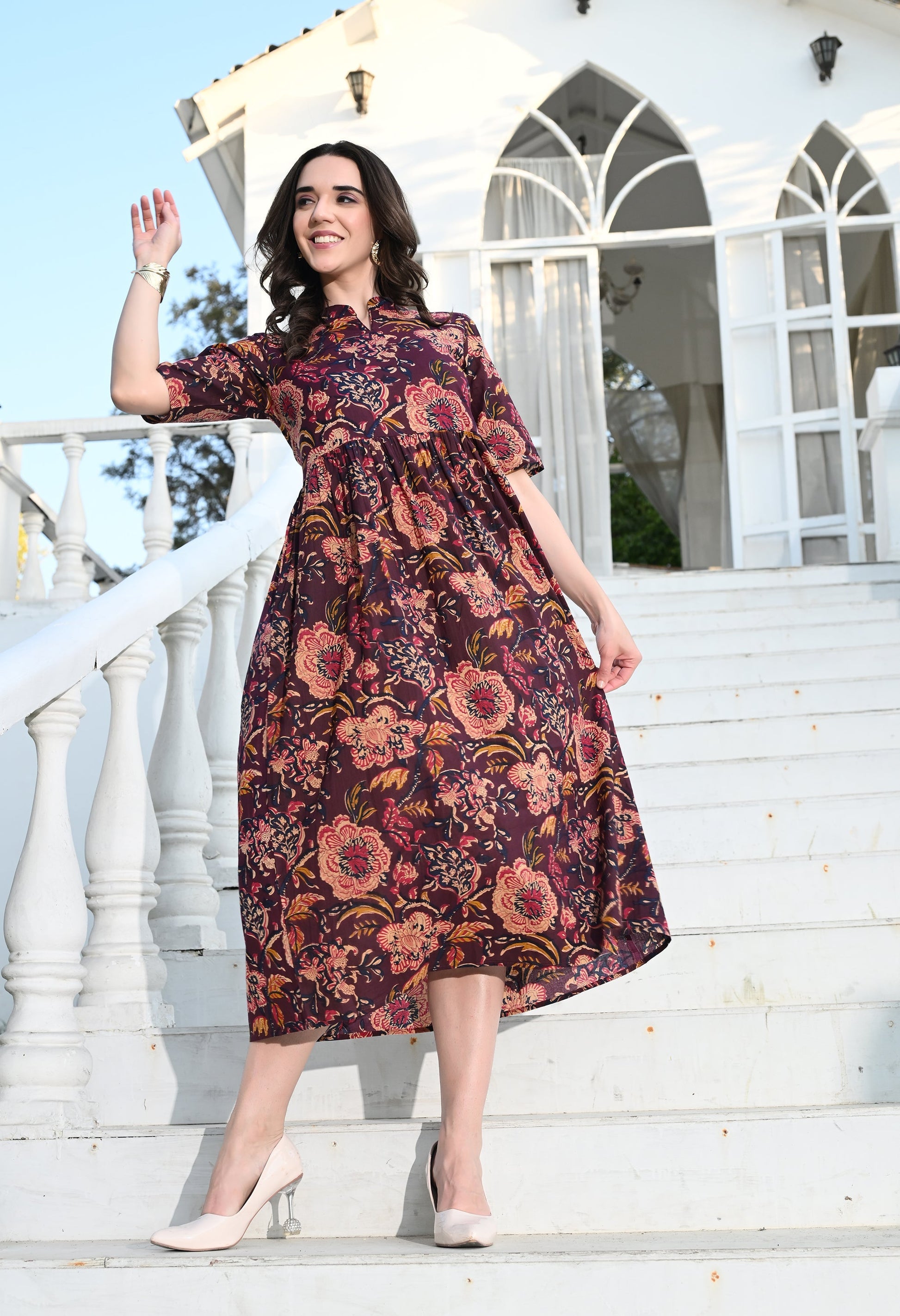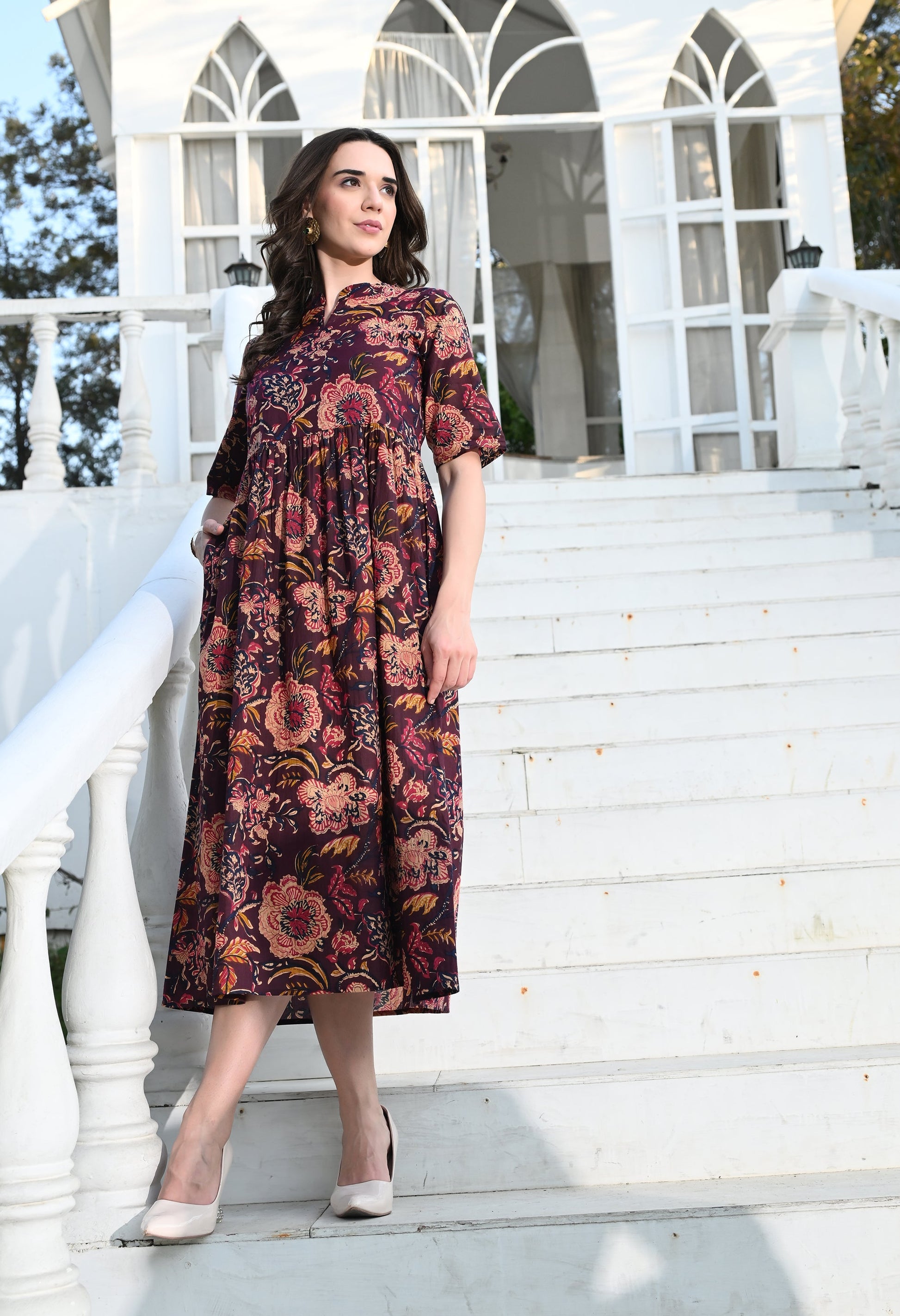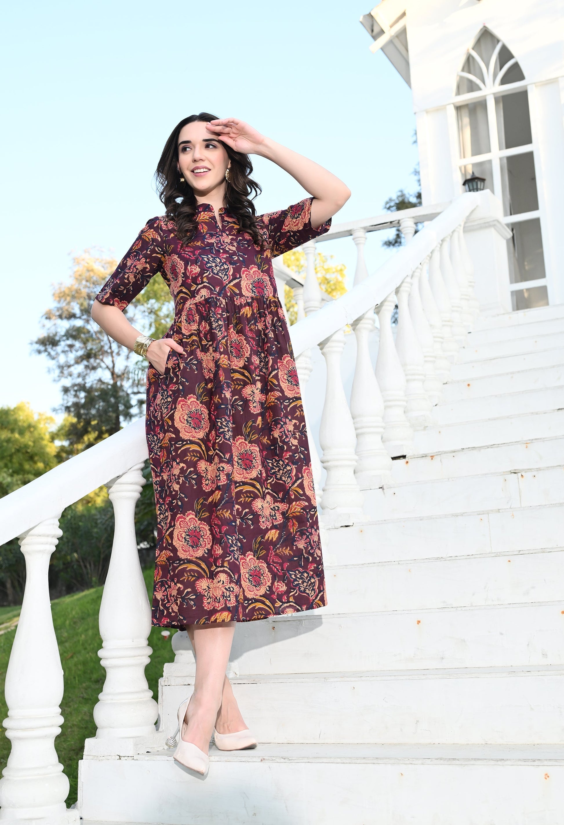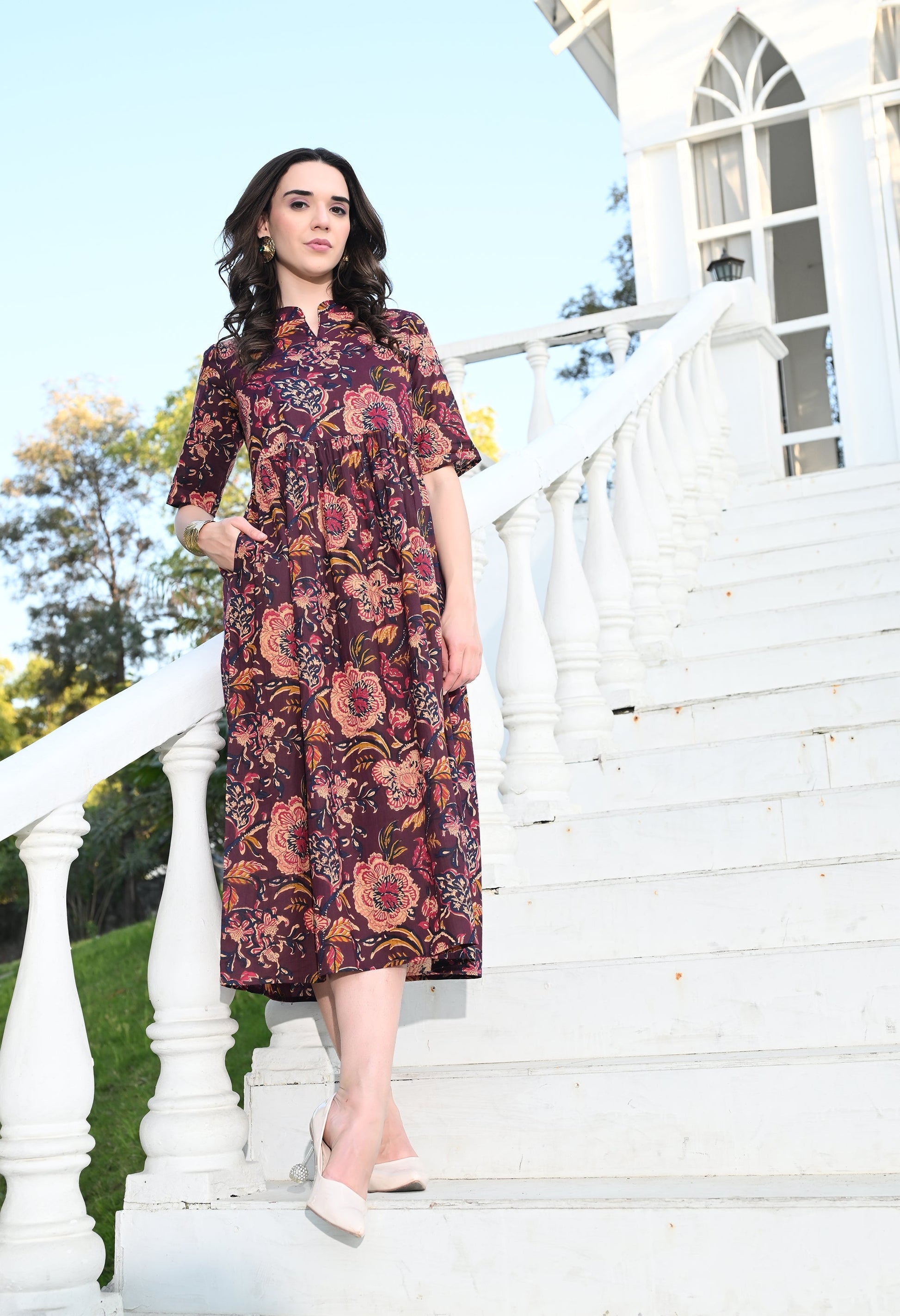 - Description: Multi Colour Empire Dress has a pocket, flared silhouette adds an elegant and graceful touch allowing you to move freely and radiate confidence with every step you take.
