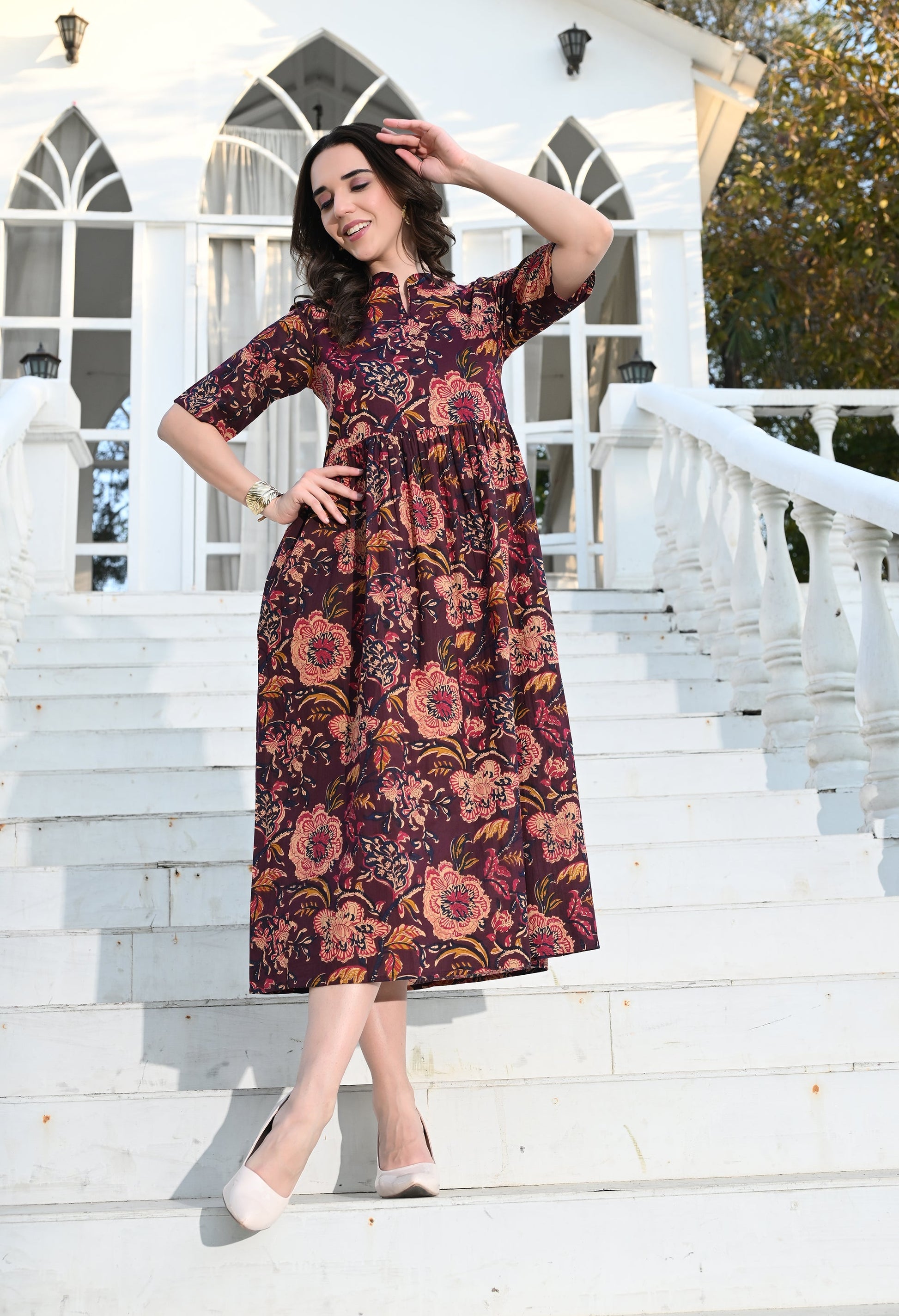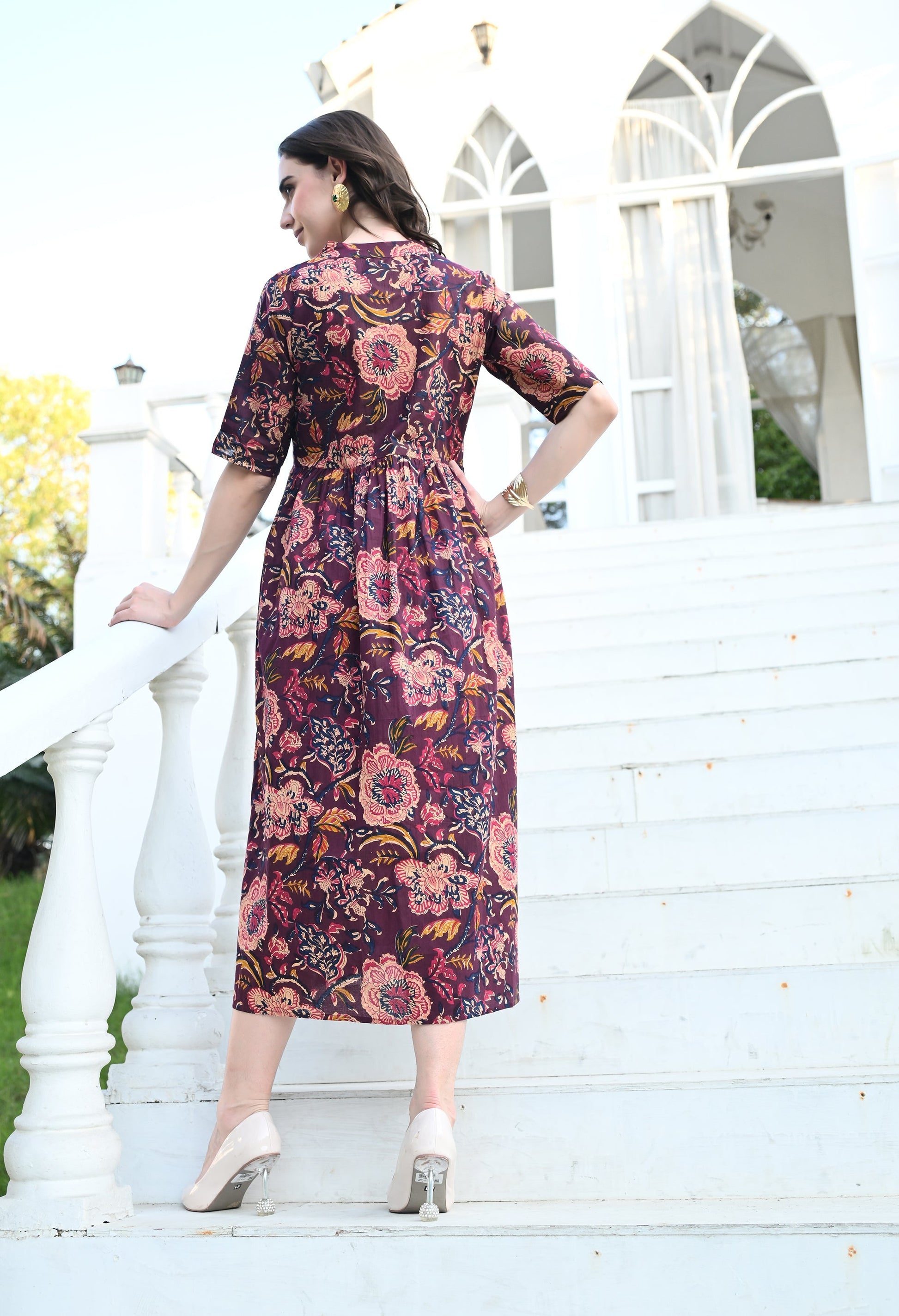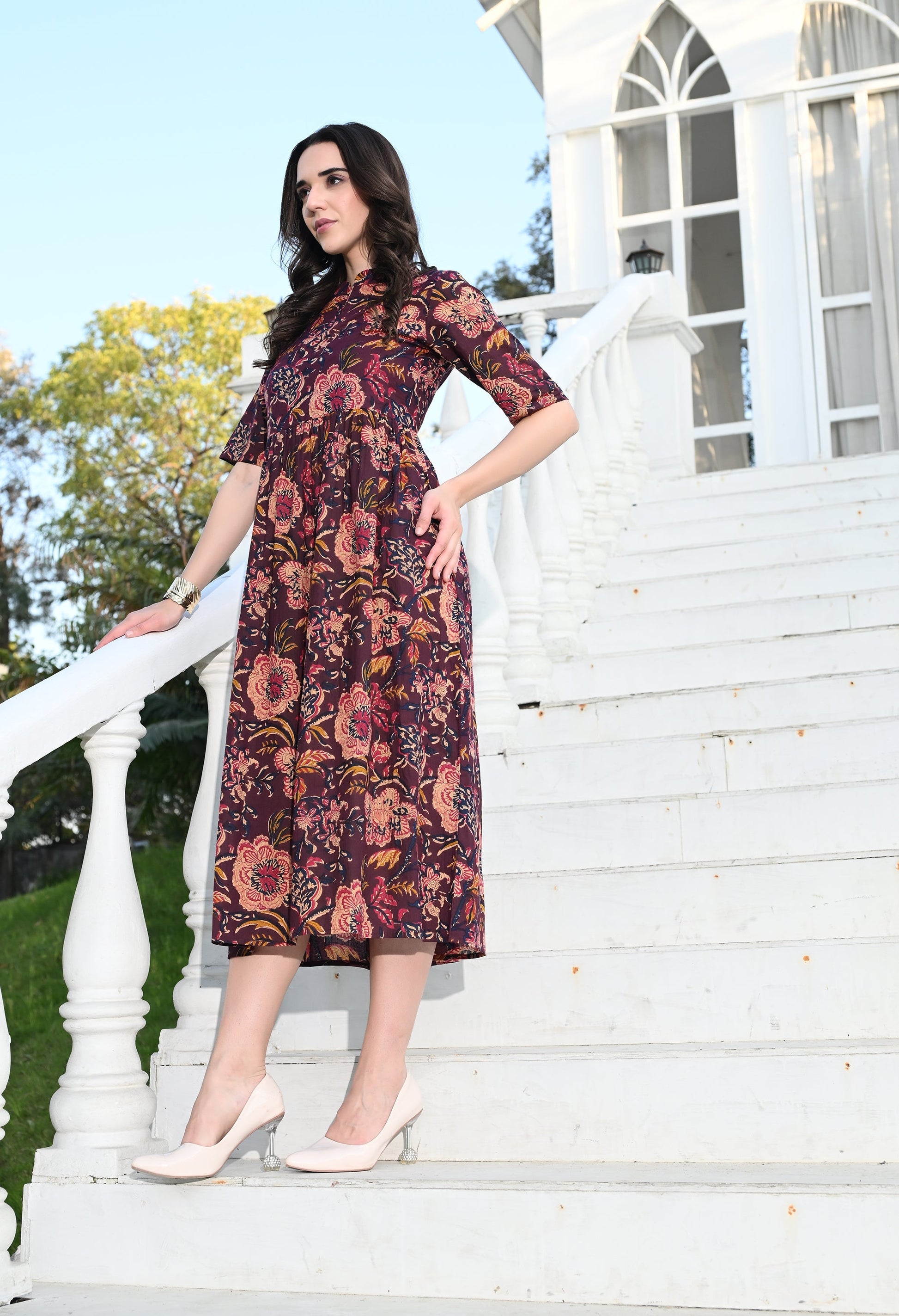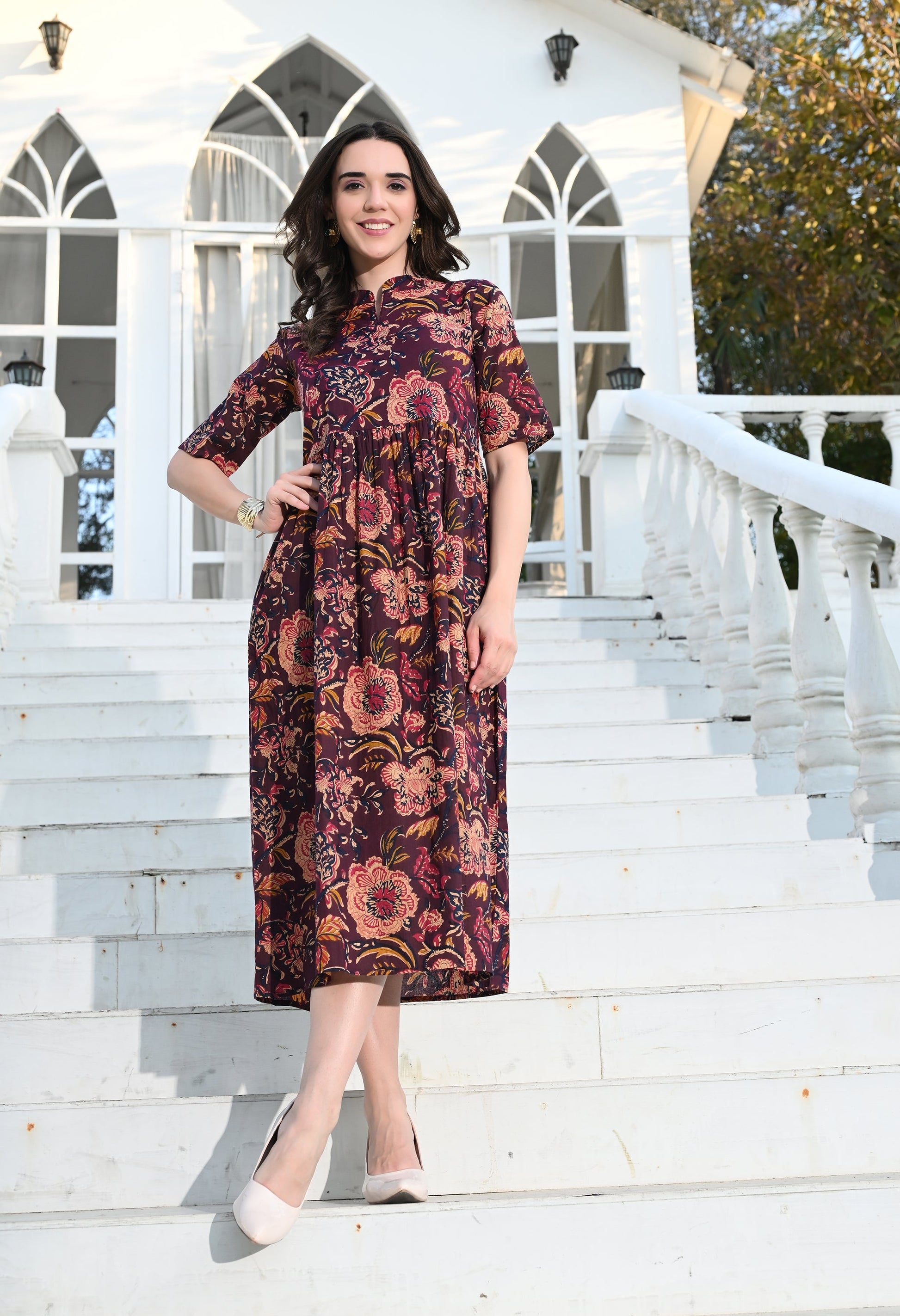 - Description: Multi Colour Empire Dress has a pocket, flared silhouette adds an elegant and graceful touch allowing you to move freely and radiate confidence with every step you take.