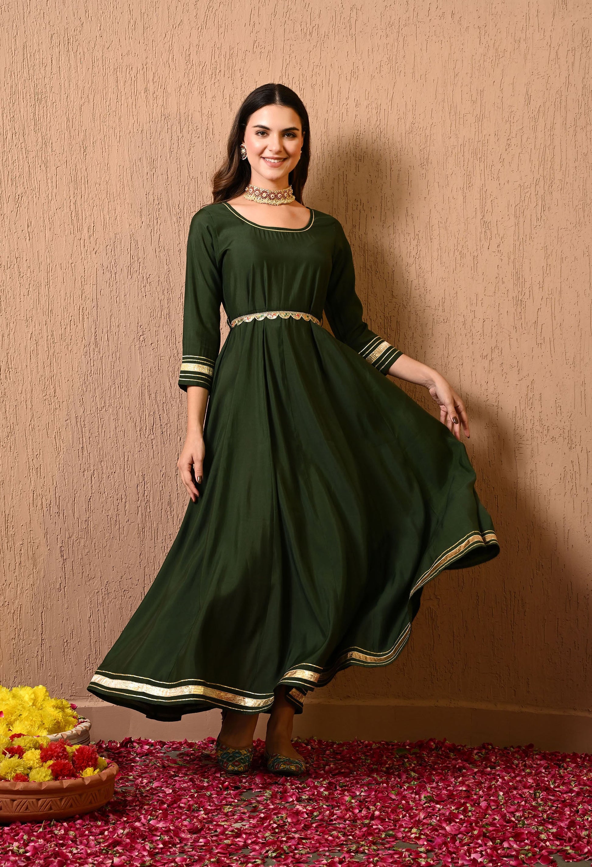 - Description: Green Silk flared Gotta dress has a embroiderd belt, three quarter sleeves. Keep your look festive classy and stylish in Dress from Deckedup.
