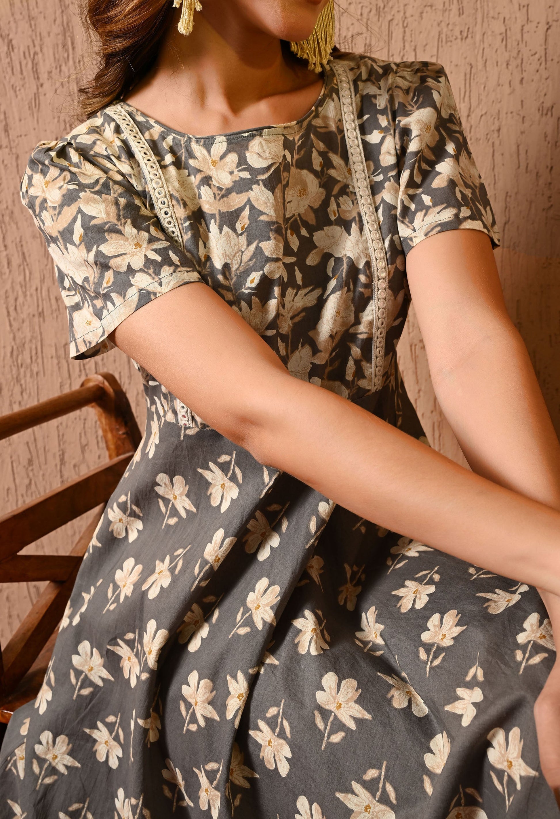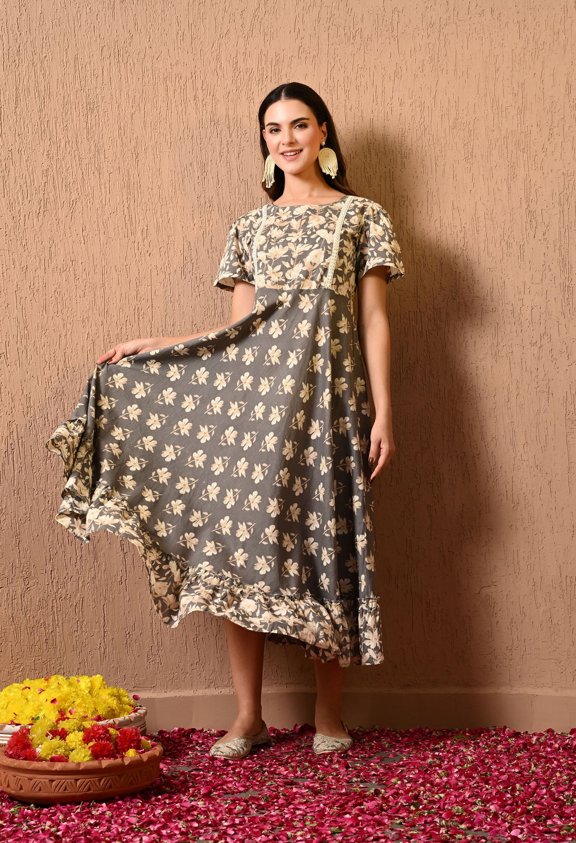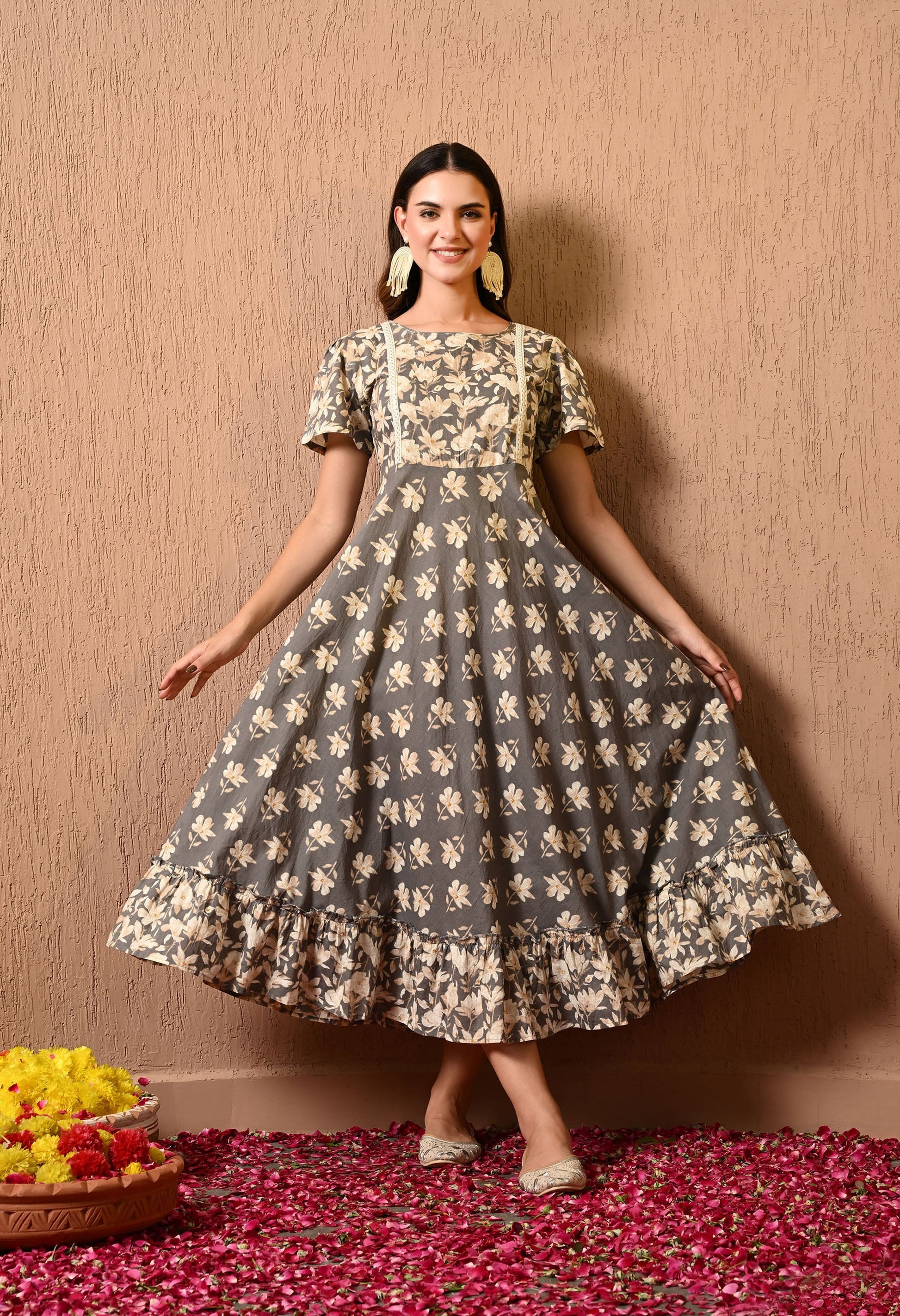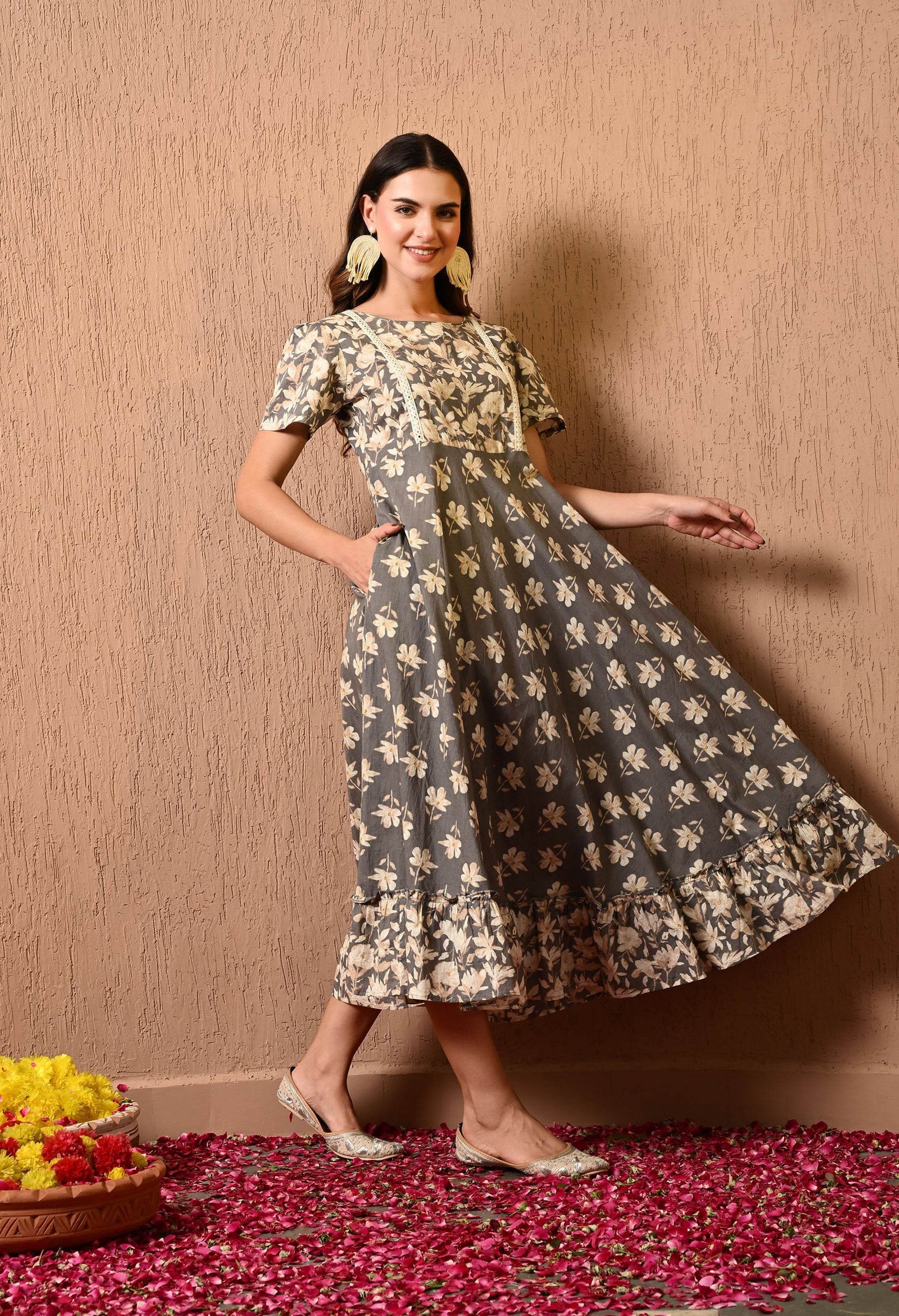 - Description: Grey Cotton print flared pocket Kurta dress has a round neck, short sleeves and mirror lace on neck. Keep your look classy and stylish in Dress from Deckedup.