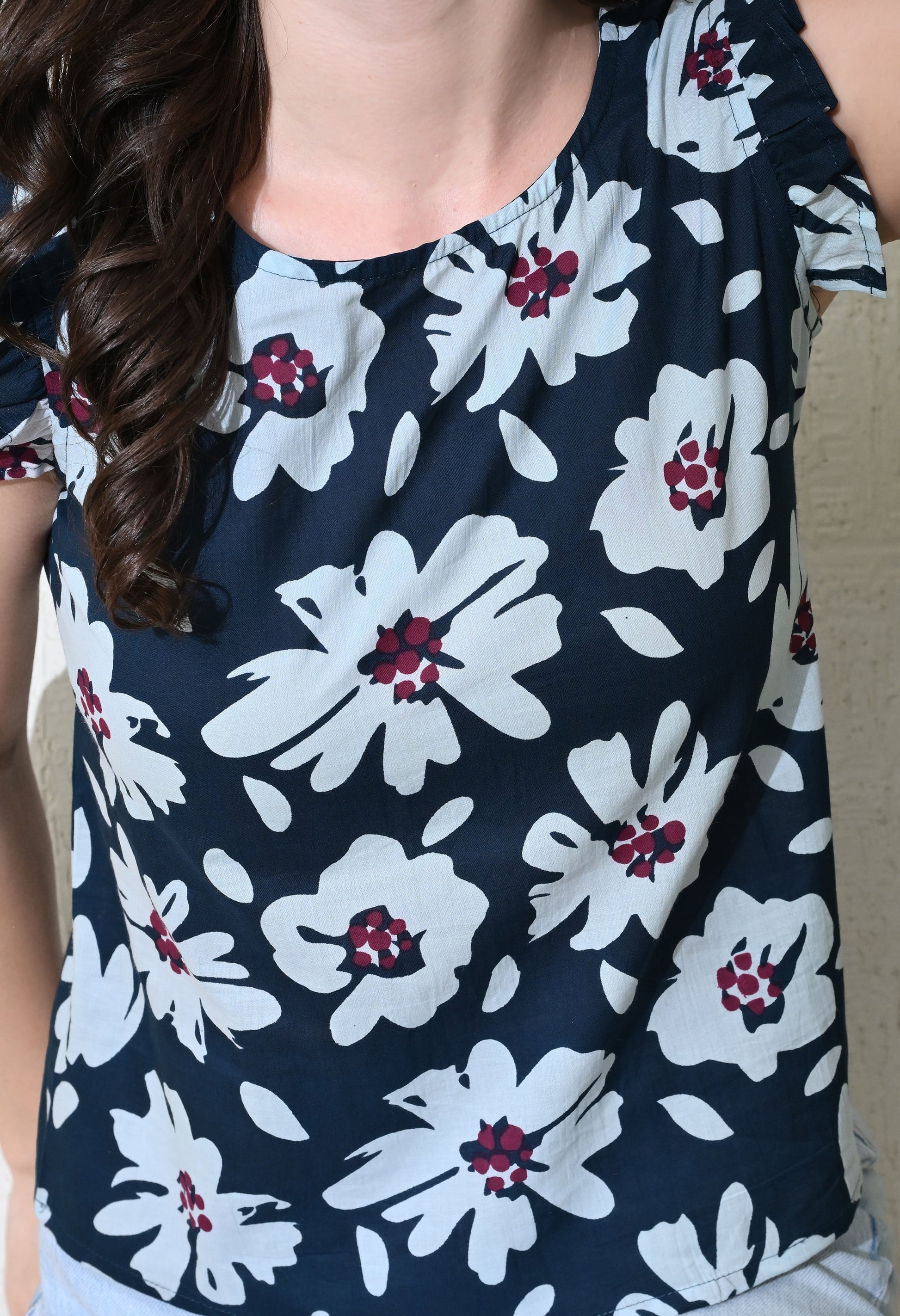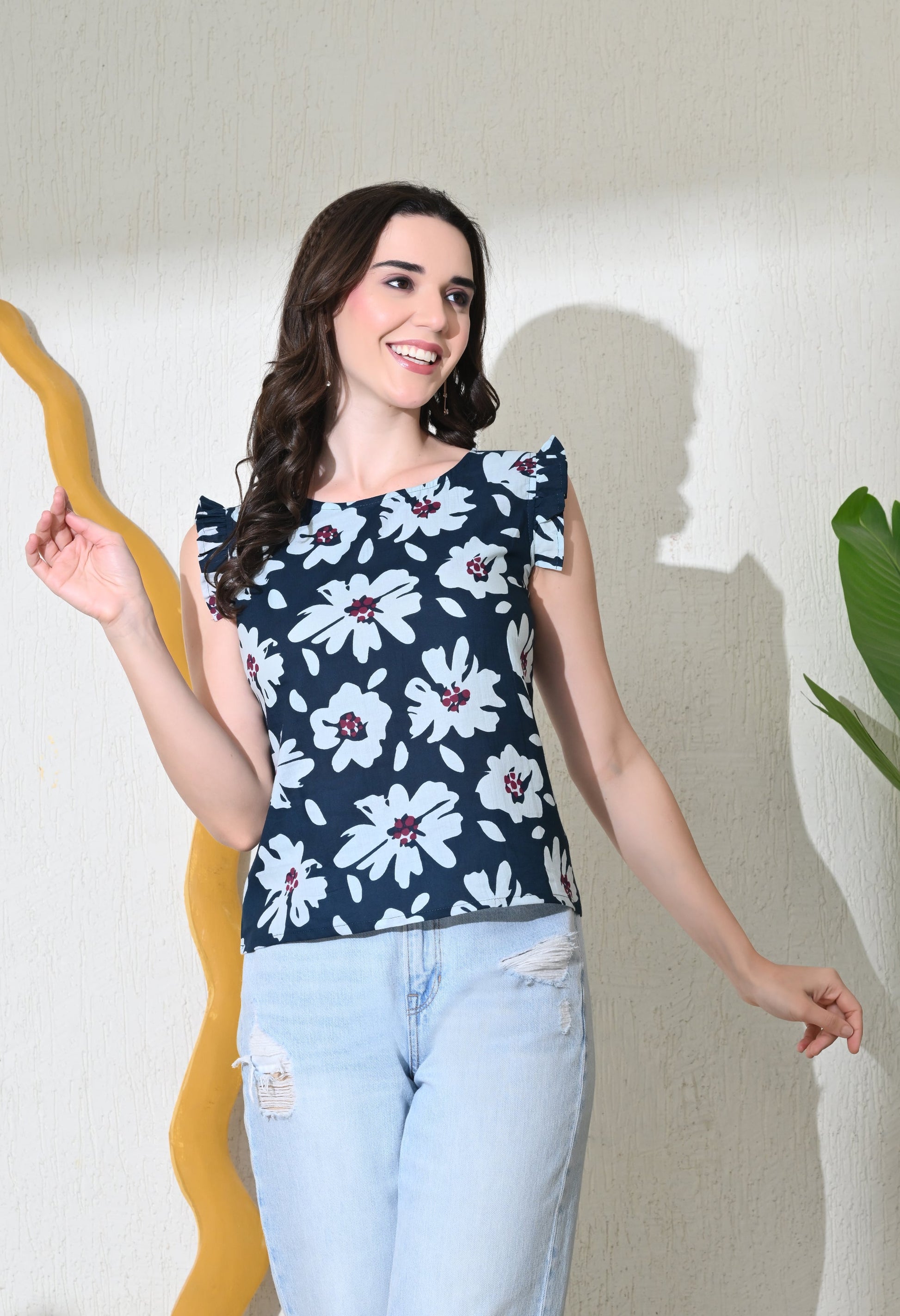 - Description: Navy Flower Print Cotton Sleevless Ruffel Top has a Round Neck, Sleevless Top is Summer top can be worn with Jeans all day long.