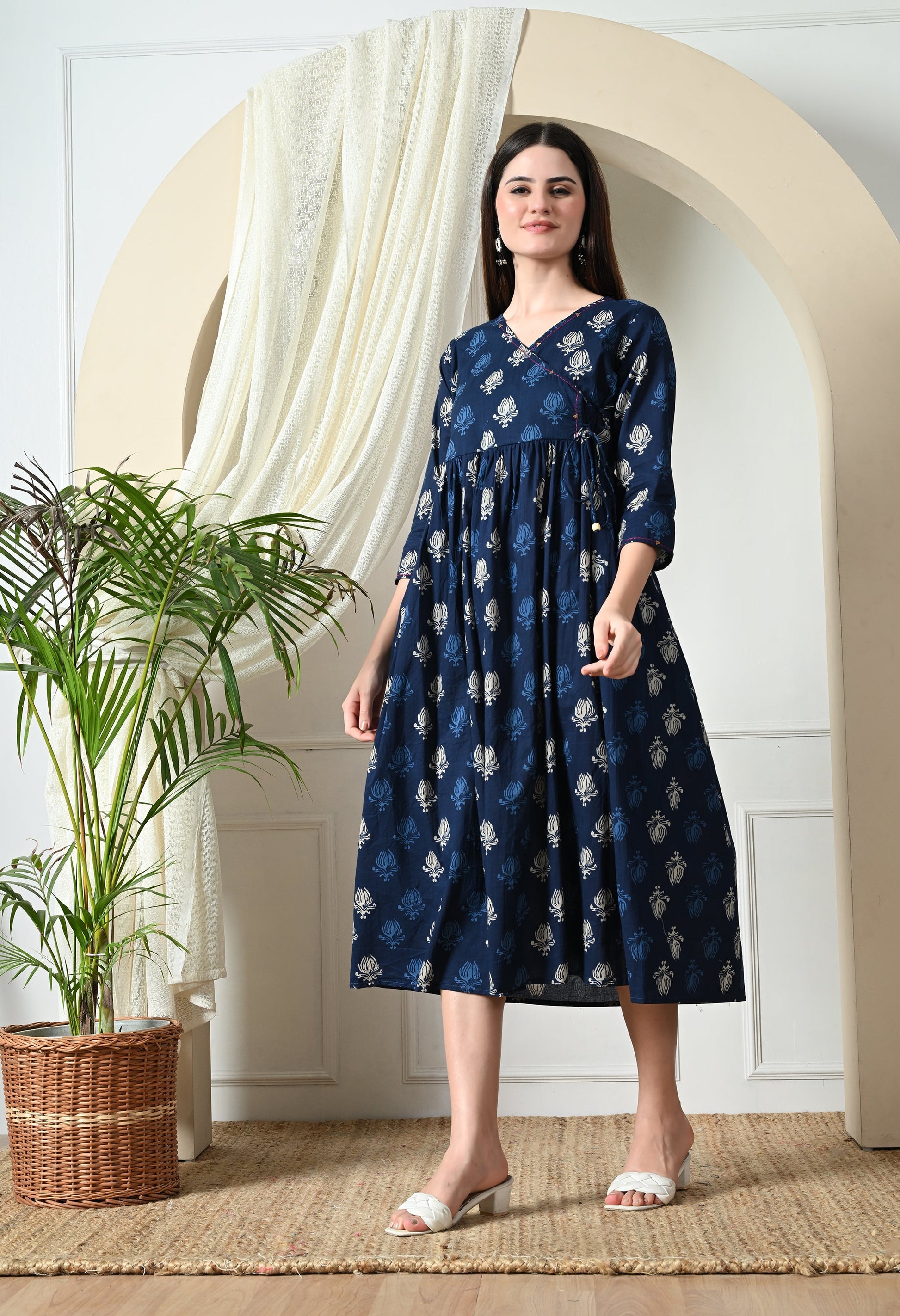 - Description: Women Indigo casual fusion dress is Midi length, falling elegantly below the knee, in comfort cotton and has a pocket,Intricate handwork embellishments grace the dress. A delightful addition to your wardrobe, perfect for both casual outings and festive days. It exudes a relaxed yet stylish charm with its unique features.Â