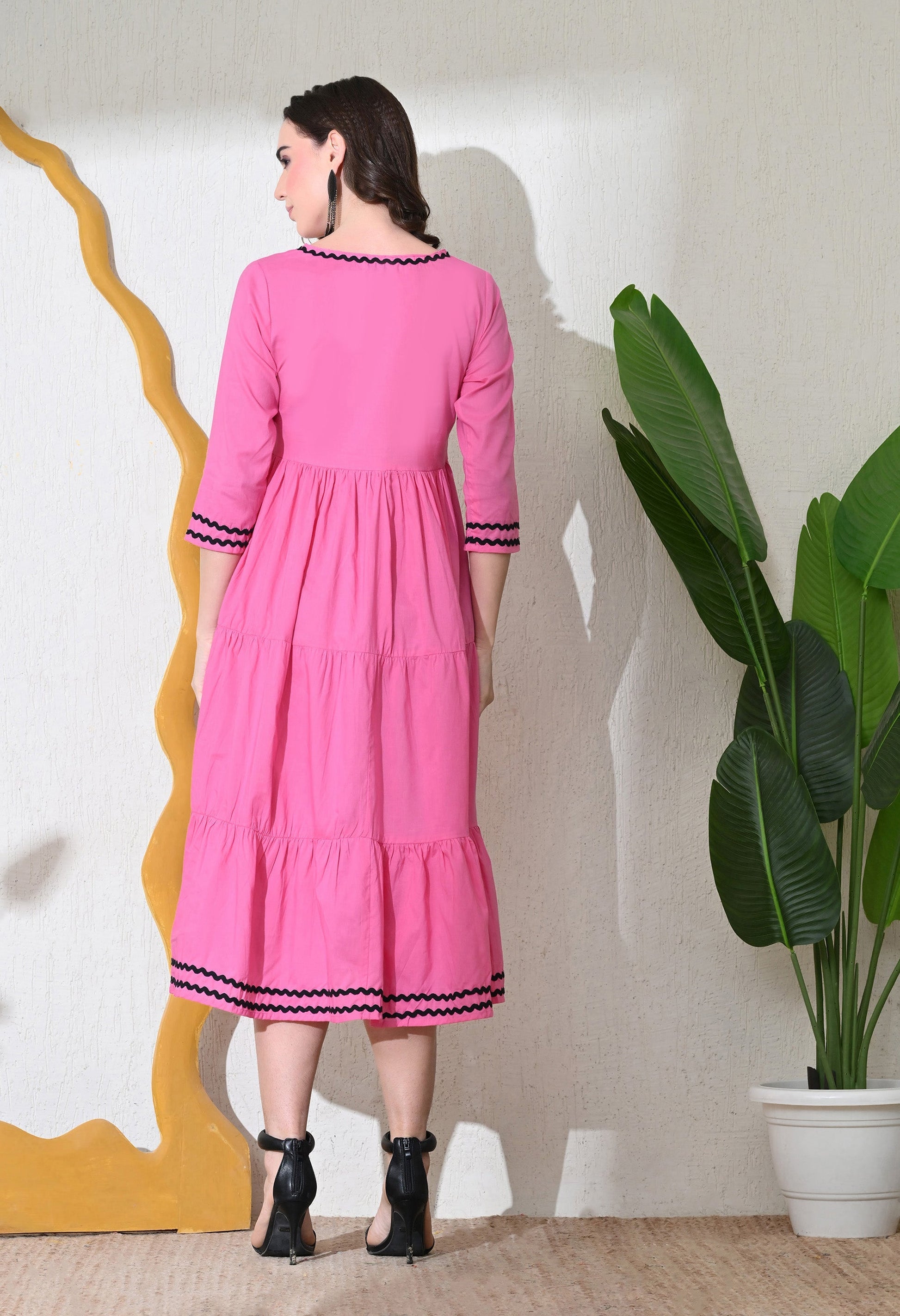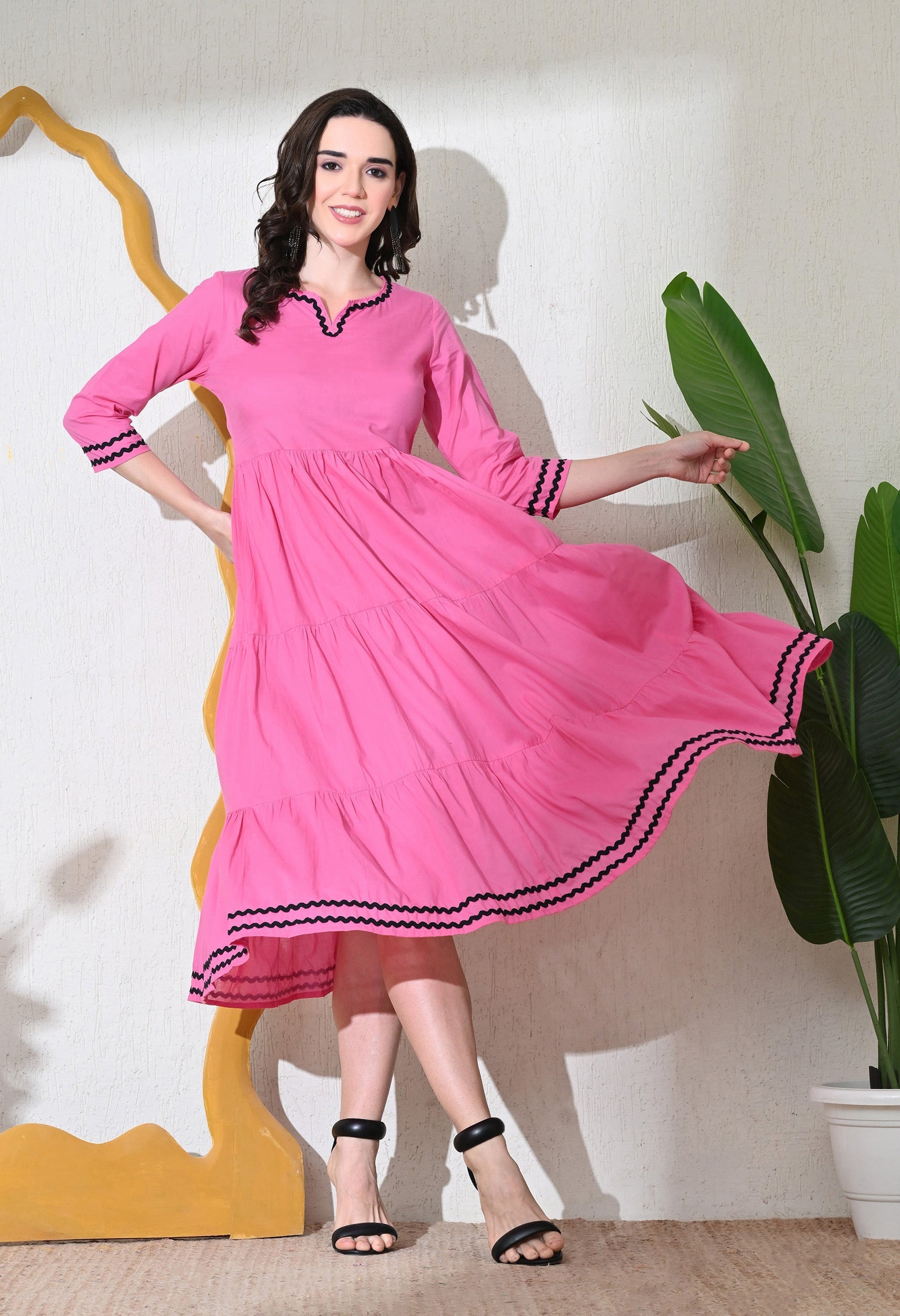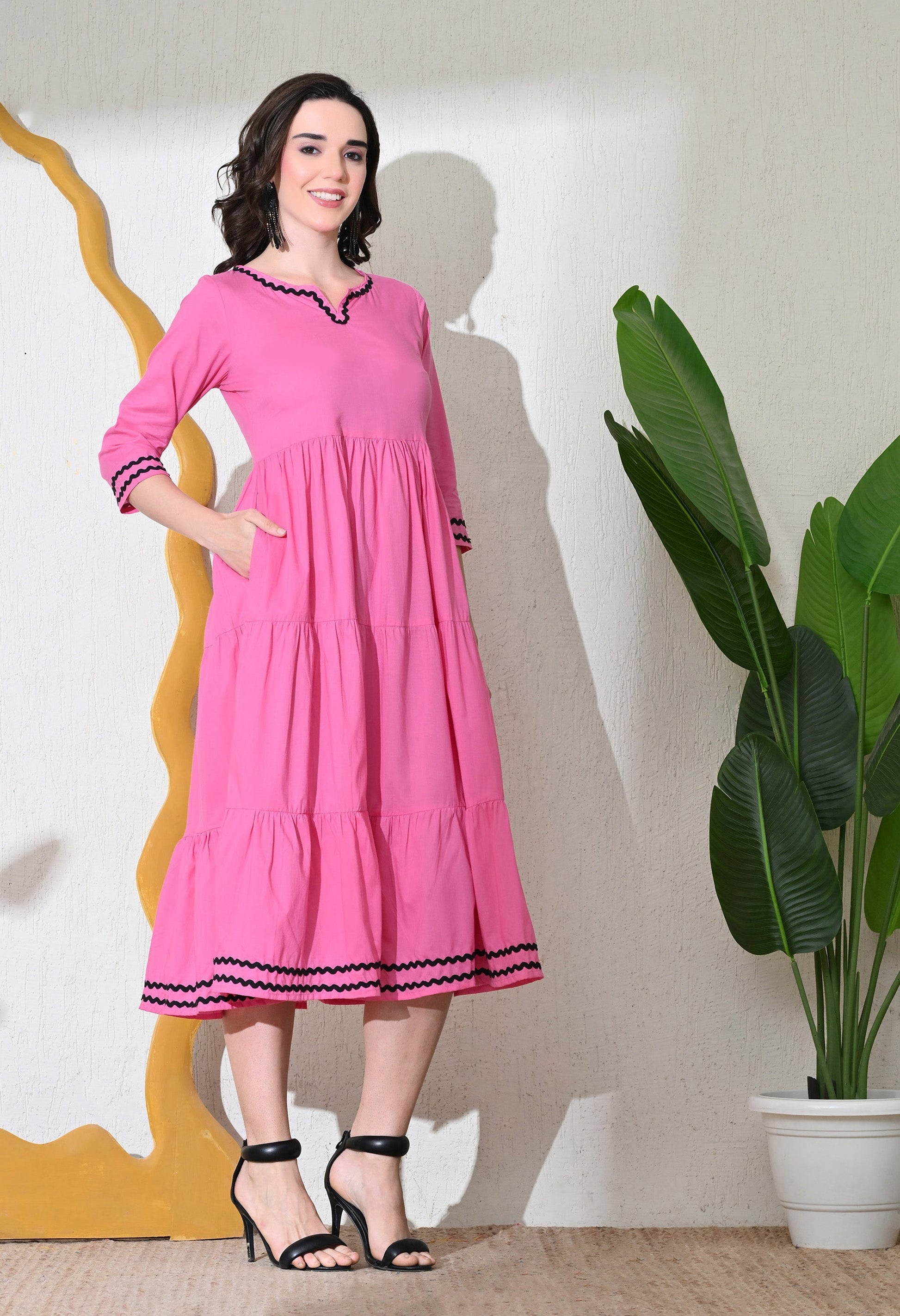 - Description: Pink Flared Dress With Beautiful lace detail,round neck,3/4th sleeves,Gathers On The Waistline and has a pocket as well.Can be worn as a Dress and Kurta as well ,Beautifully designed and comfort Fit are the unique feature.