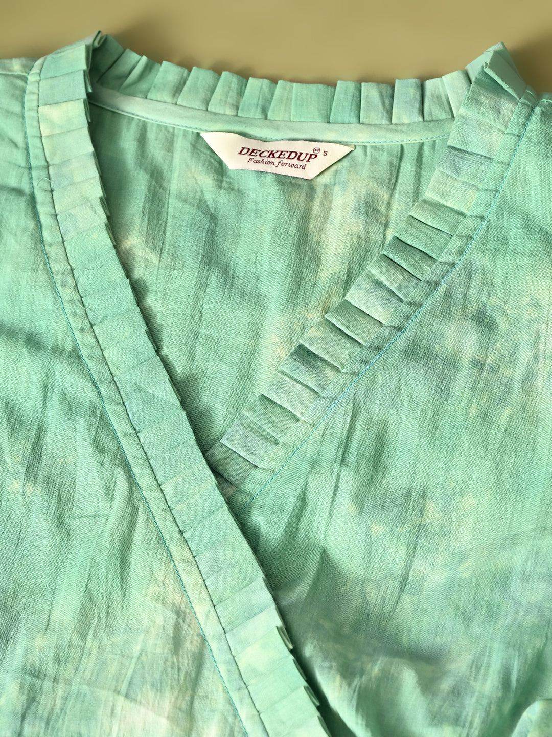 - Description: Green Shaded Print Cotton Aline Wrap Dress With Belt For Tie-Up,With Short Sleeves, V-Neck,Ruffles On Neck And Sleeves Which Adds A Style Note To Dress.