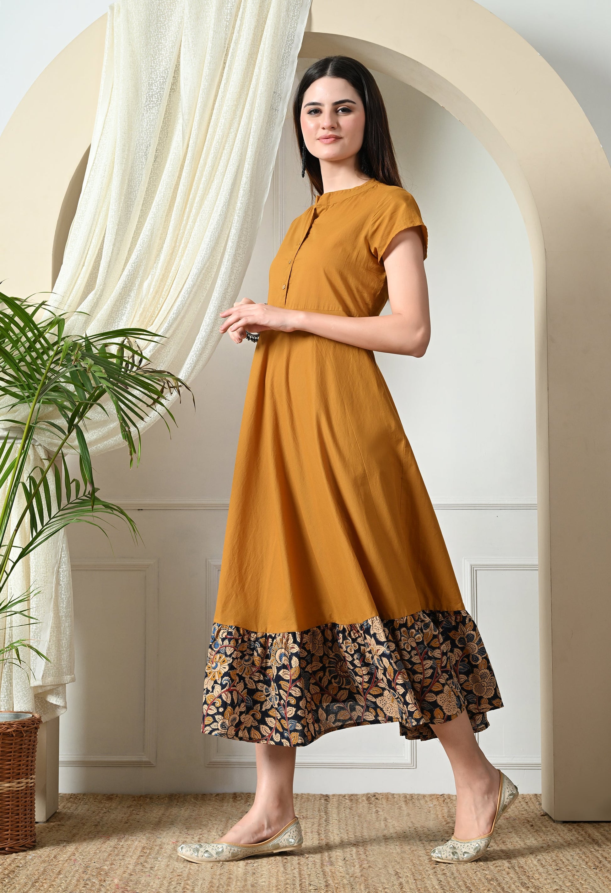 - Description: Kalamkari print Cotton women's dress with amazing flare and look is a popular choice for a wide range of occasions, from casual outings to more formal events. This dress offer comfort, breathability, and style, making it a versatile addition to any wardrobe.