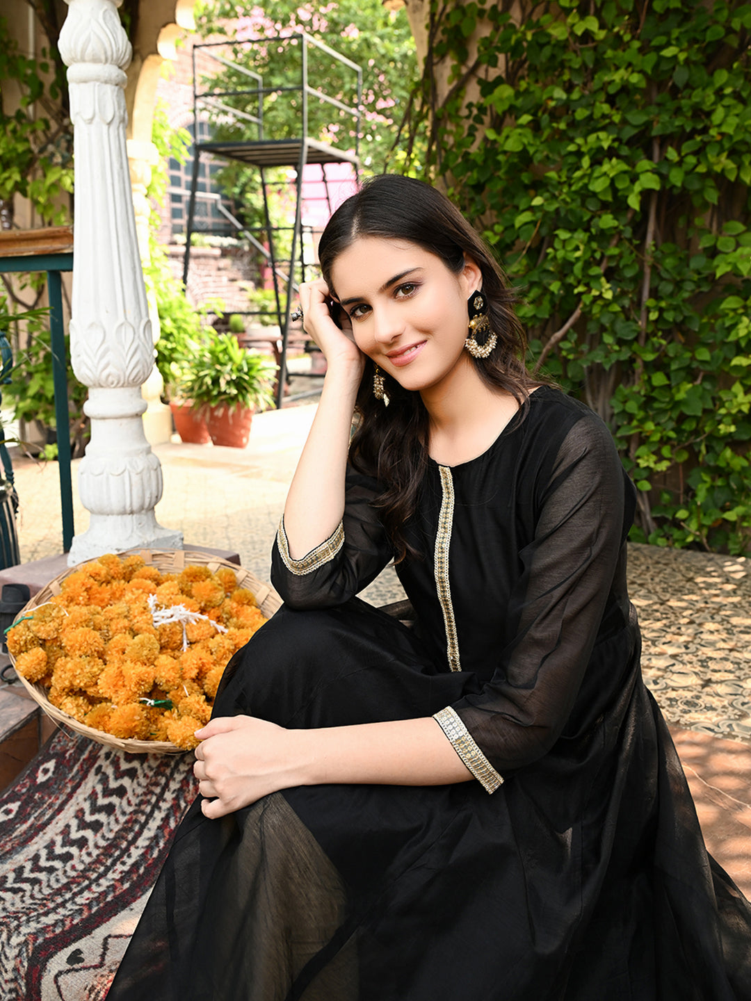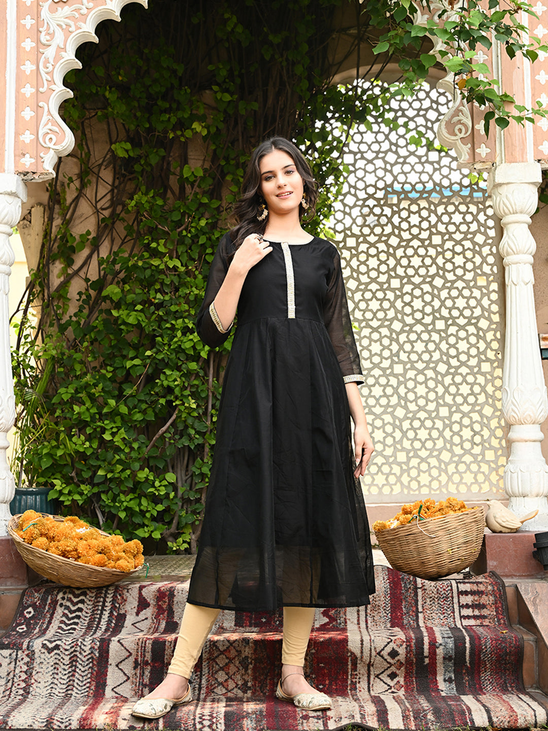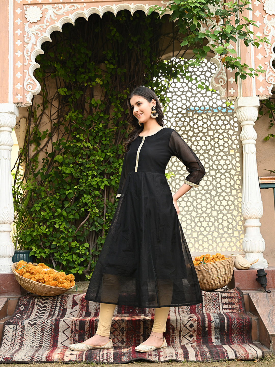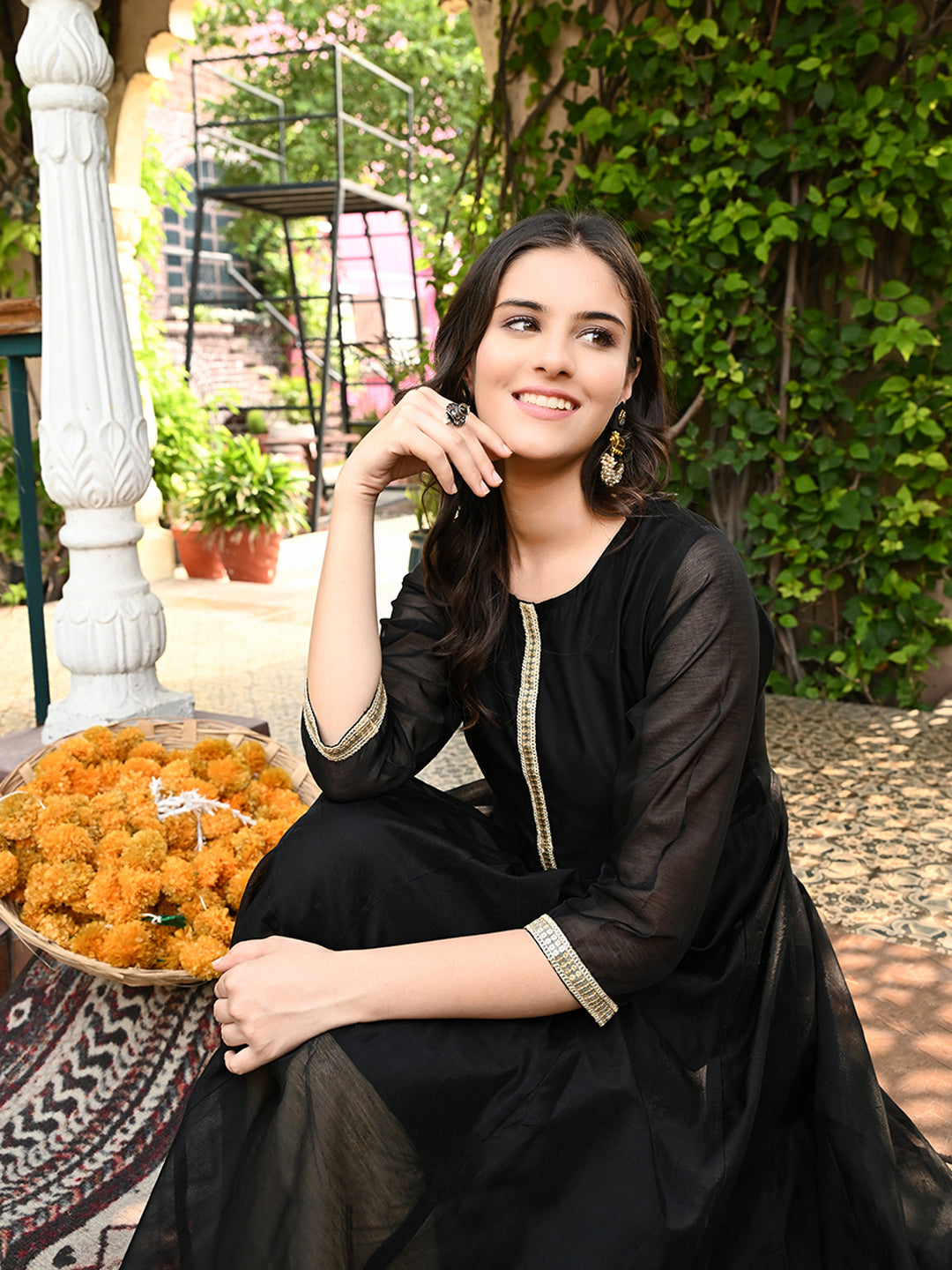 - Description: Black Chanderi Embroidered Anarkali Is A Festive Or Party Wear. It Exhibits Embroidery On Kurta, Made With High-Quality Material, It Is Designed To Perfection. Style It With Heels To Elevate The Party Look Overall Look.