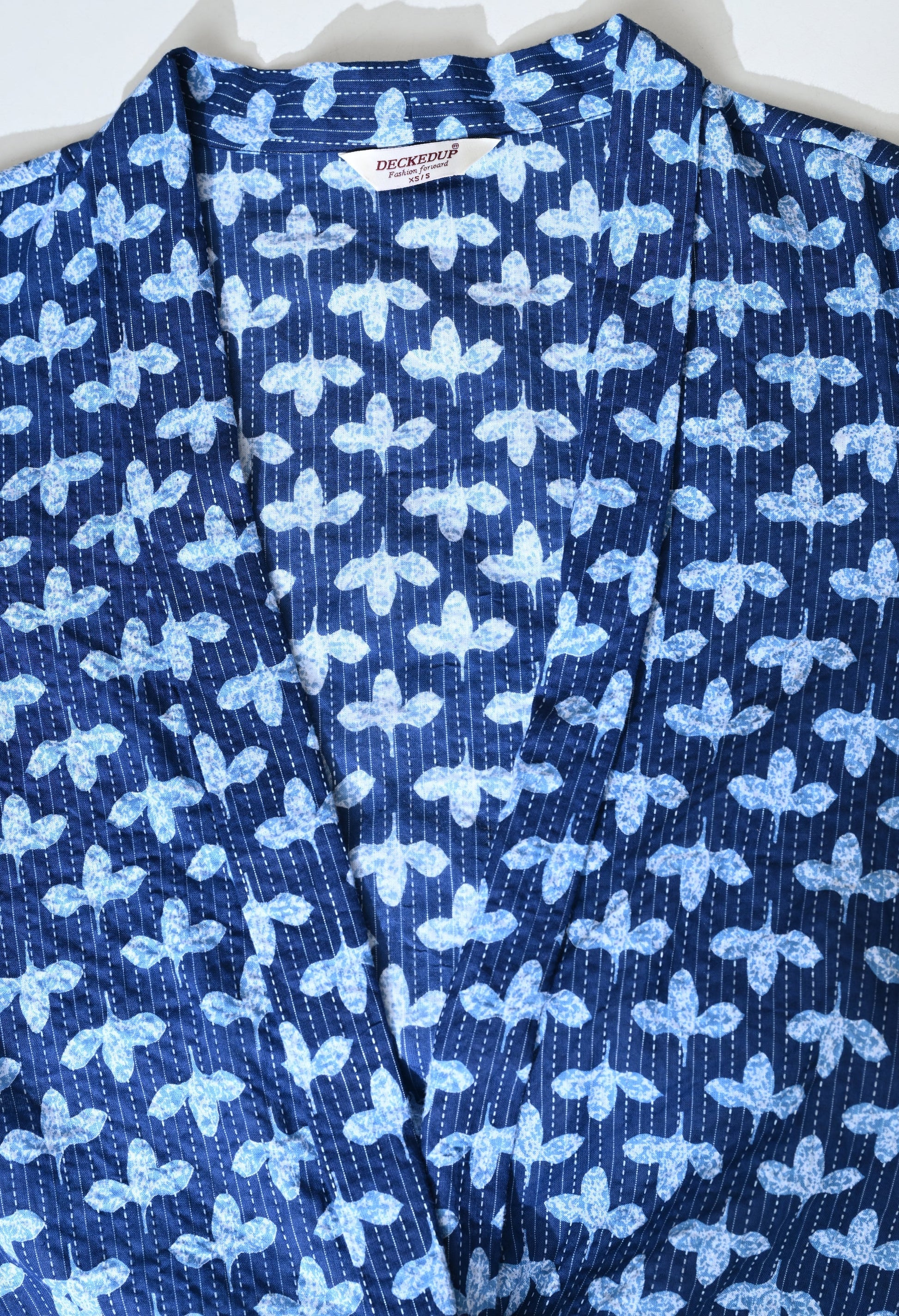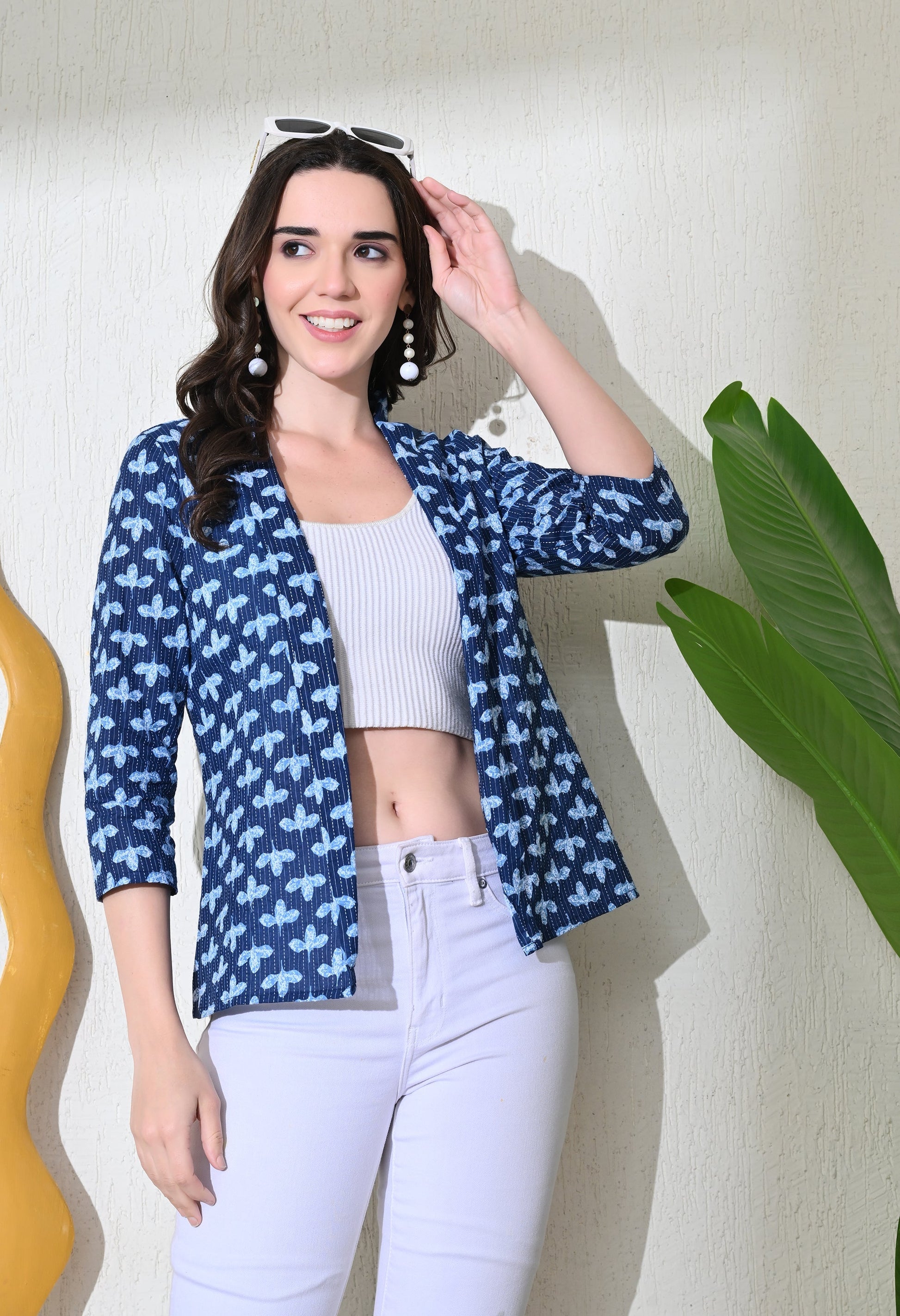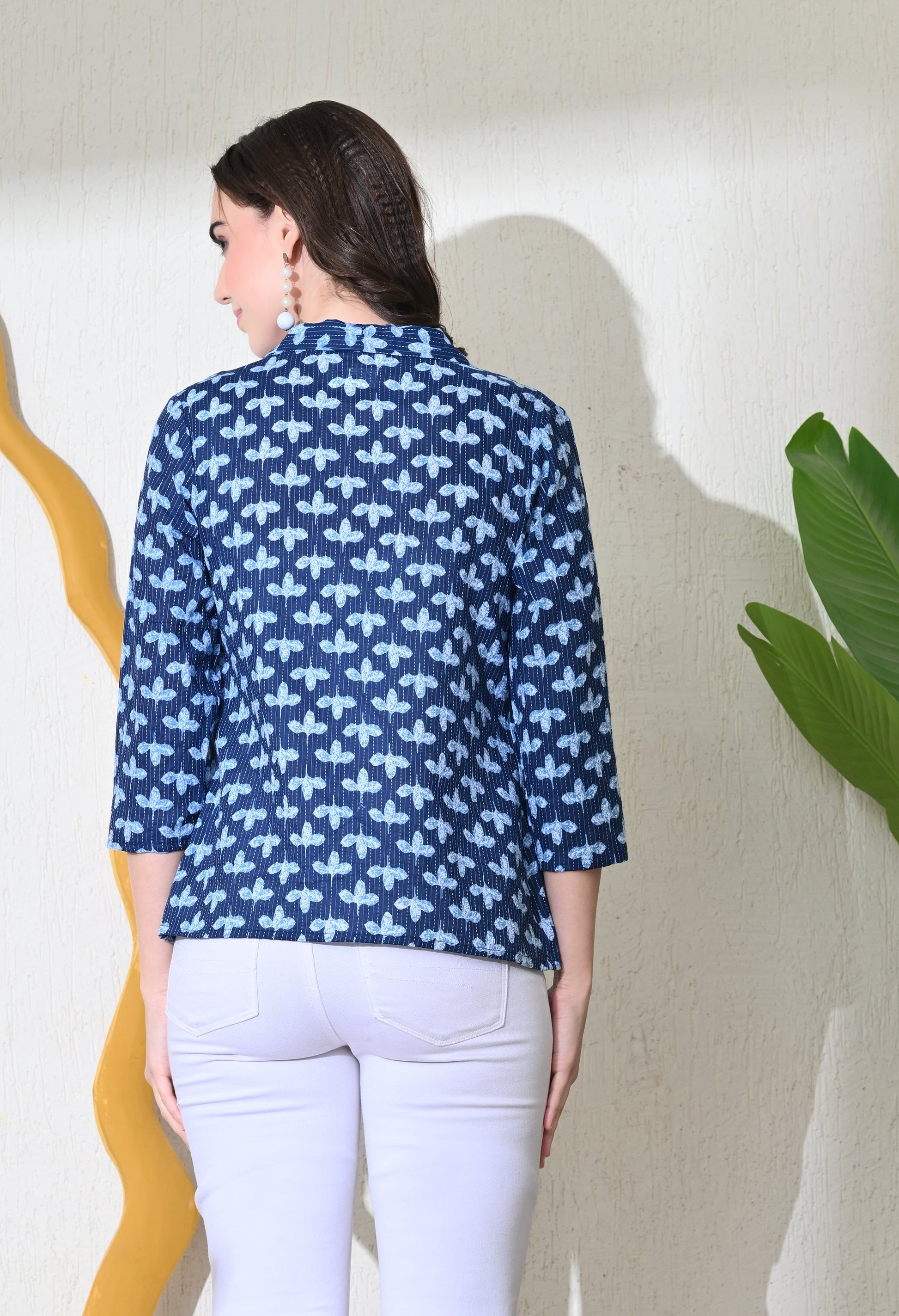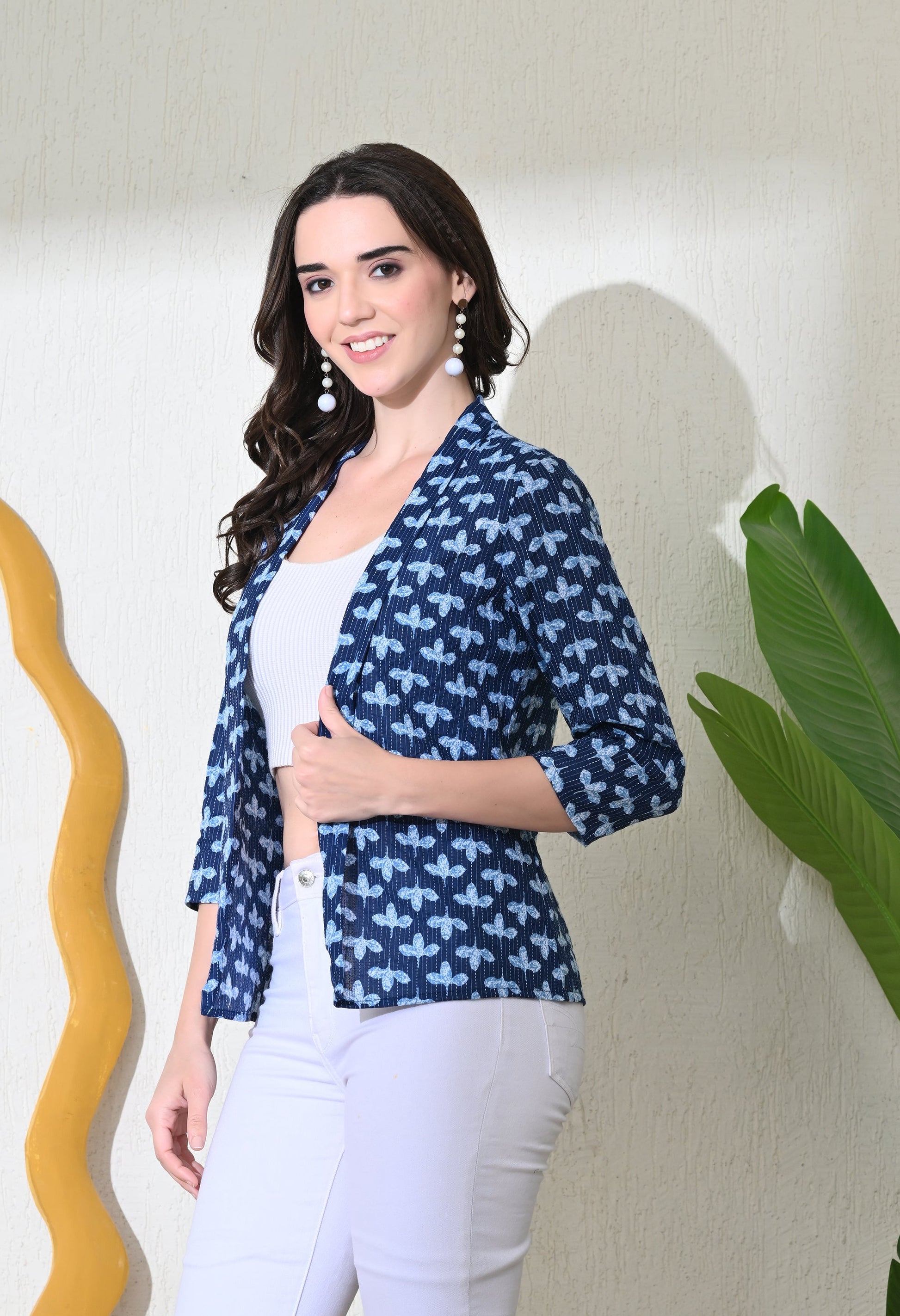 - Description: Add style to your wardrobe with this Blue shrug crafted from best kantha cotton fabric. Its 3/4th-length sleeves and open collar create an effortlessly stylish look, perfect for a variety of occasions. The lightweight fabric ensures comfort and breathability, making it a reliable choice for warm climates.