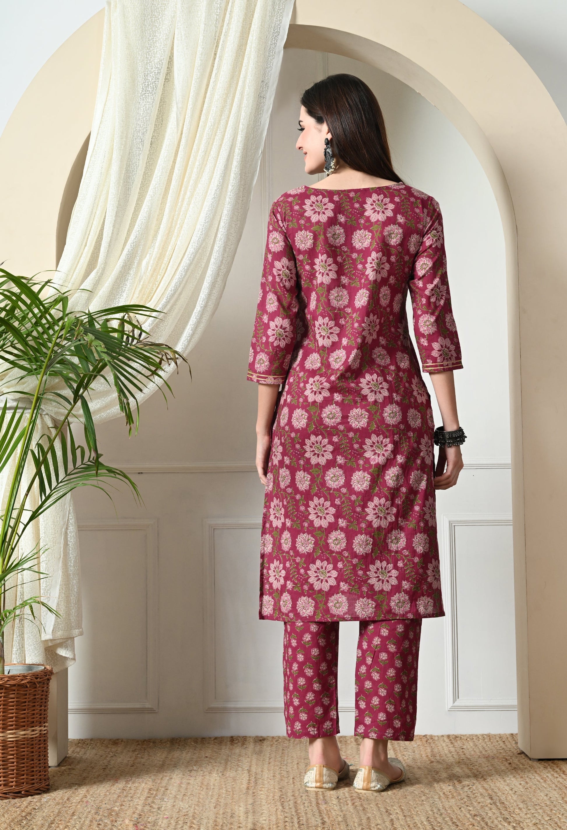 - Description: Women Burgundy Cotton Kurta Pant set with round neck yok with embroidry has bead work on yok and crocet lace and made with comfort cotton . Celebrate your personal style and roots with this elegant kurta and pant set.Deckedup is a ready to wear brand that focuses on a global Indian Women.
