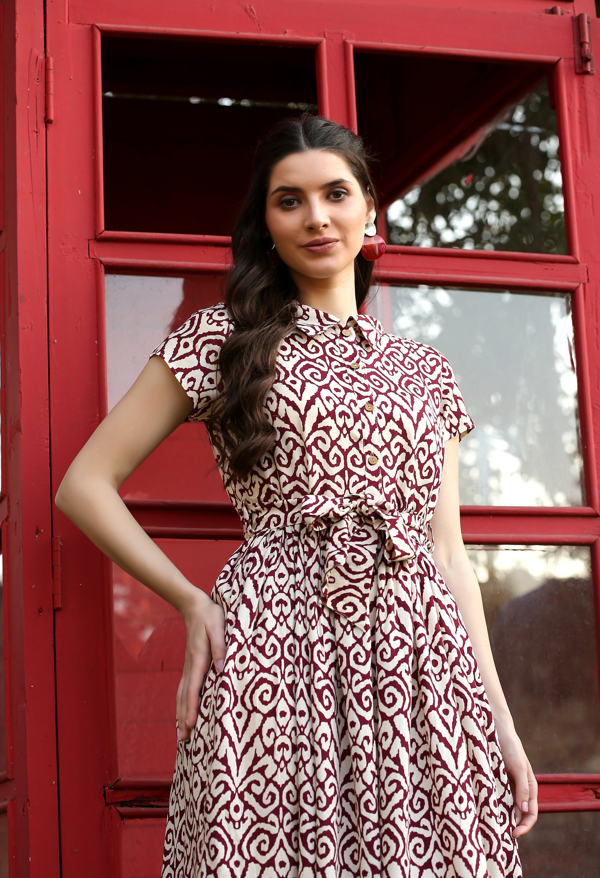 - Description: Exclusive digital print Dress with shirt collar and short sleeves.For best fitting belt attached also has front openable buttons.