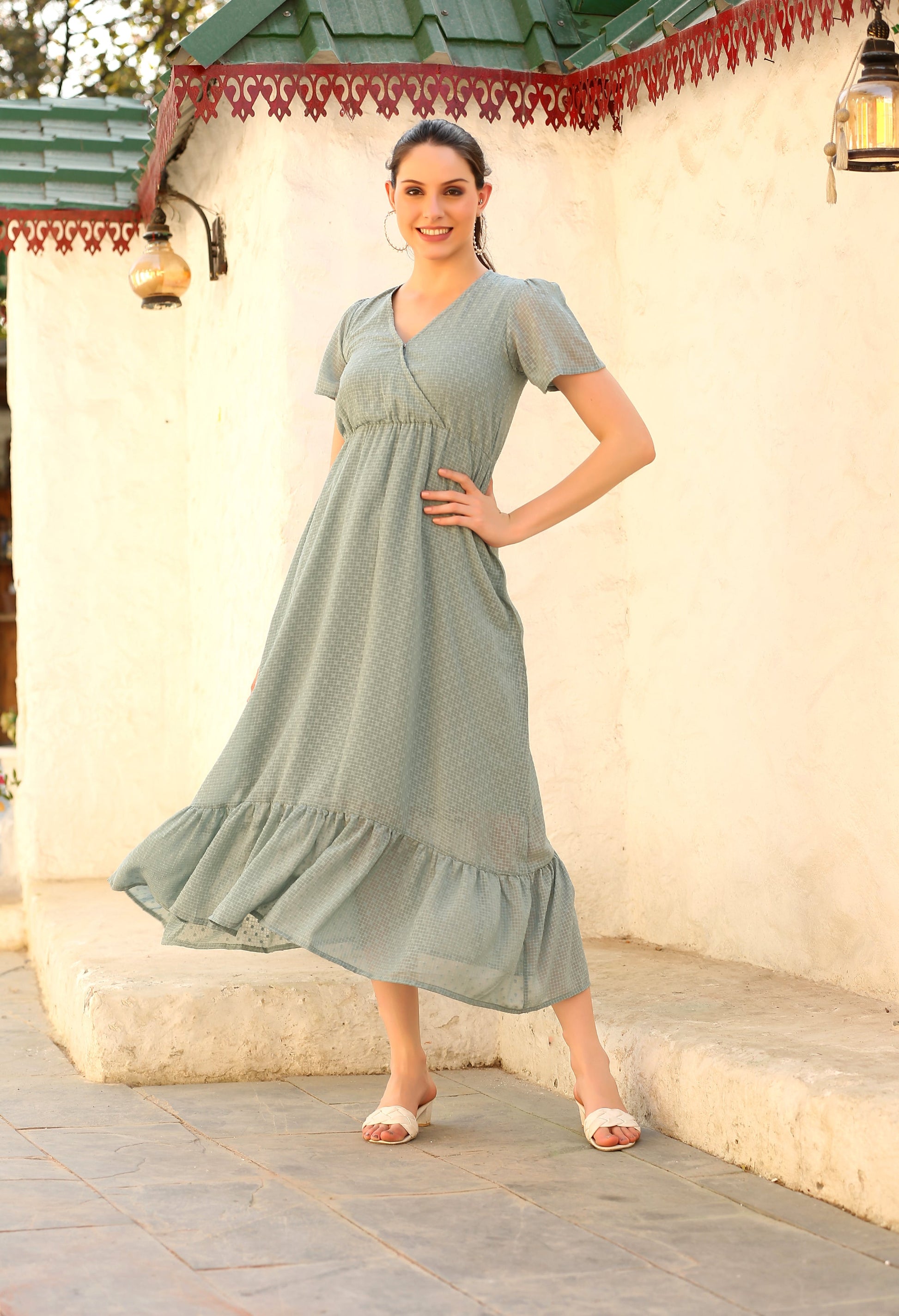 - Description: Women Green Aline Georgette Dress With Beautiful self texture, lining attached, v neck with button ,elasticated Gathers On The Waistline.Beautifully Highlighted with light frills on hem and short sleeves .