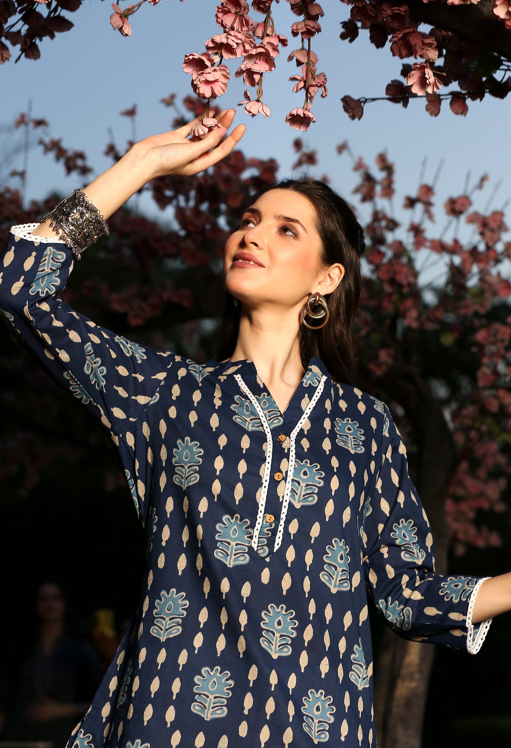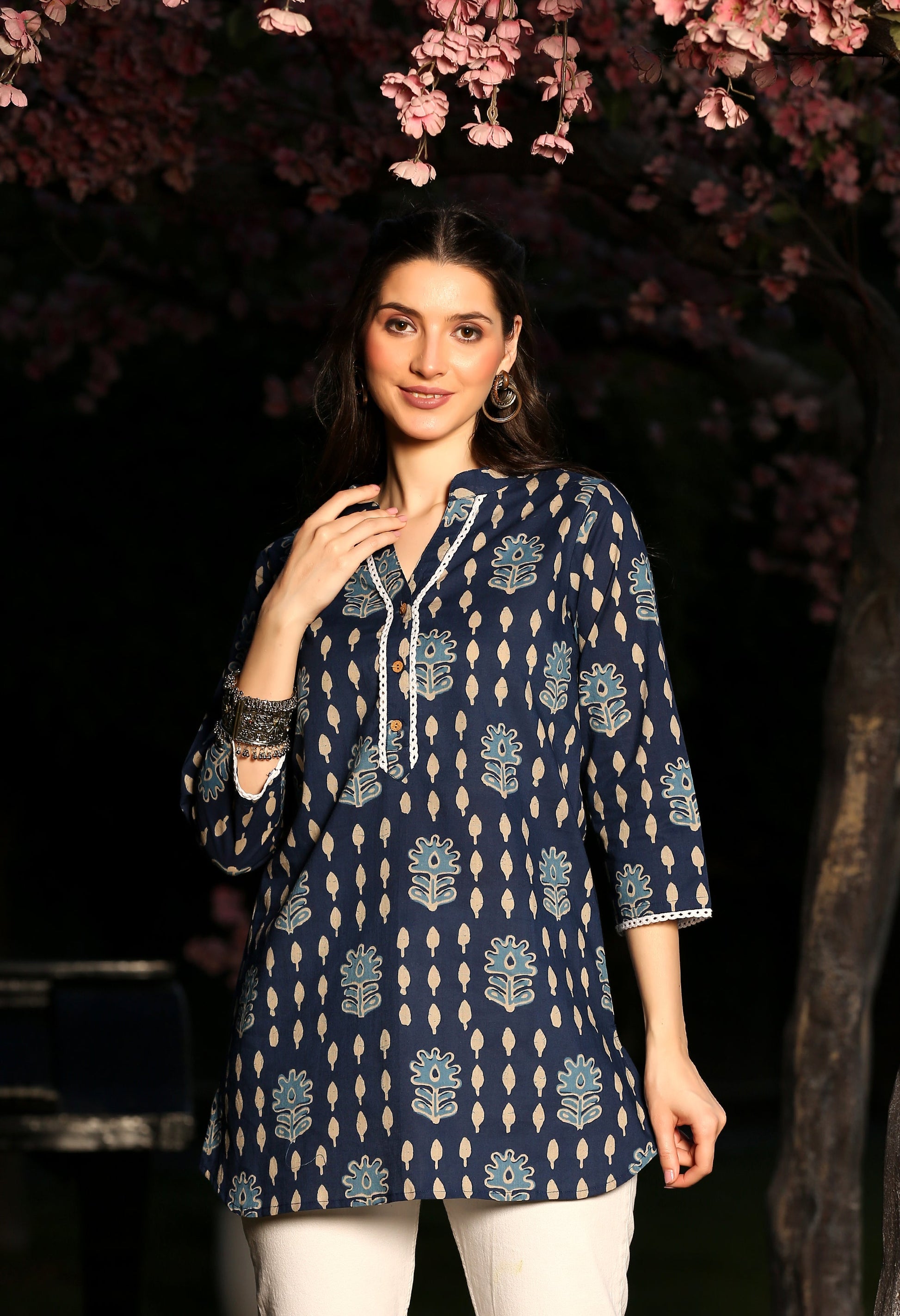 - Description: Indigo summer print cotton tunic with beauitful crocet lace on neck, chinese collar and buttons closure.