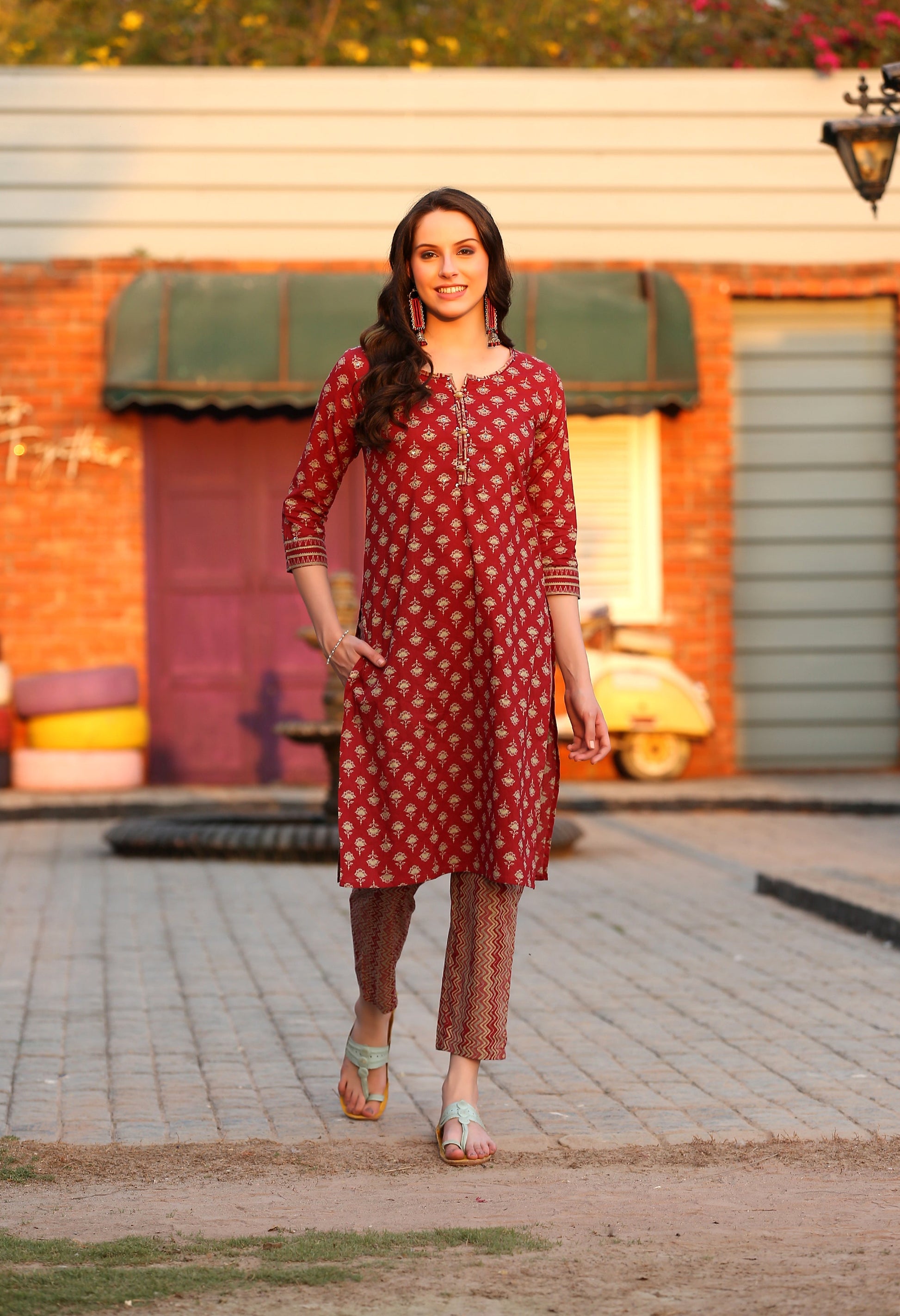 - Description: Women Red Kurta Pant set with round neck has bead work and made with comfort cotton . Celebrate your personal style and roots with this elegant red kurta and pant set.Deckedup is a ready to wear brand that focuses on a global Indian Women.