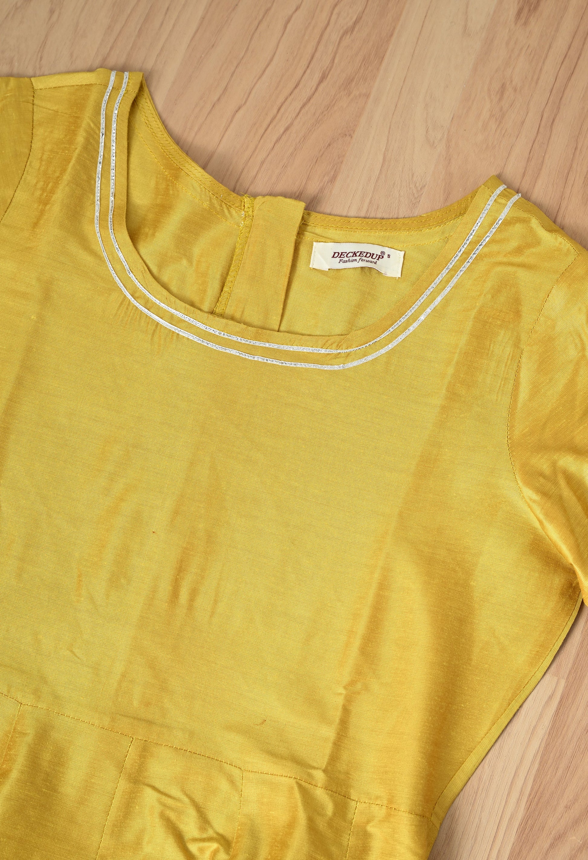- Description: Yellow Cotton Silk women's dress with amazing flare and with gotta detailing on neck and sleeves has back zipper for fitting. Wear from casual outings to more formal events. This dress offer comfort, breathability, and style, making it a versatile addition to any wardrobe.
